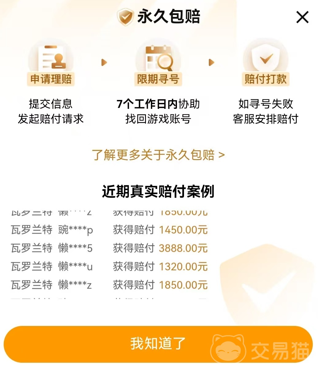 交易猫对所有用户都进行了非常严格的认证,尤其是卖家更是需要进行实人制认证,绑定自己的芝麻信用等一系列操作,这样可以将每个商家的信用情况都直接展现给所有人。买家可以选择和信用良好的商家进行交易,这样可以减少很多麻烦,也净化了整个交易环境。第二项优势在于所有在这里出售的成品号都获得了永久包赔的赠送服务。如果账号被找回,会由平台按照额度来进行赔付。所以即使在这里交易的是很多外服的账号,也不用担心安全性问题。只要带有全额赔付标签,就是真正值得信赖的。部分赔付也可以自己升级成全额赔付。