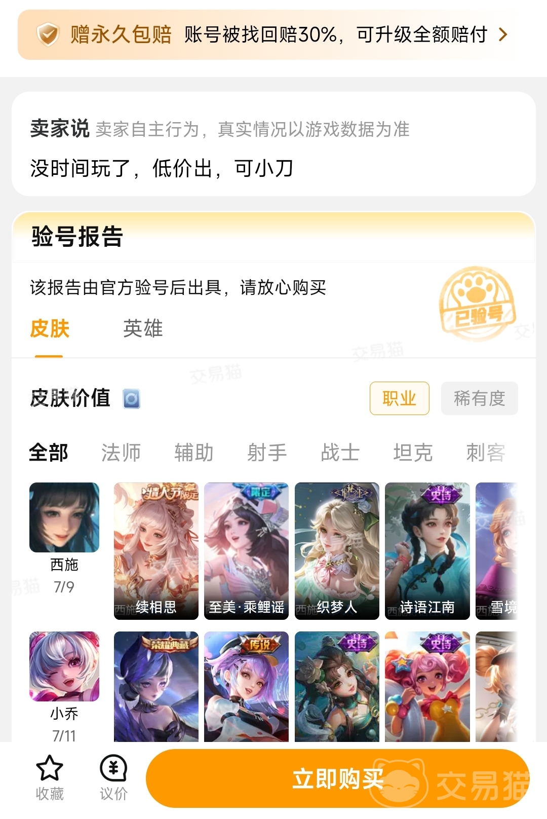 想要买号的话,更要选择交易猫了,上架到这个平台上的账号都是真实的,交易猫更是全场赠送【永久包赔】服务,保护好买方的利益。关于永久包赔的具体理赔时间和赔付额度,玩家可以点击账号详情页了解。玩家如果在选择账号时选择的是带有【官方验号】服务账号的话,本次交易会很快达成。带有官方验号标识的账号内的内容都是完全真实的,整个验号过程都有详细的图片证明,更有平台盖章的验号报告来证实。在报告详情上还会标注具体的验号时间,让买方对于账号的详情有更全面的了解。