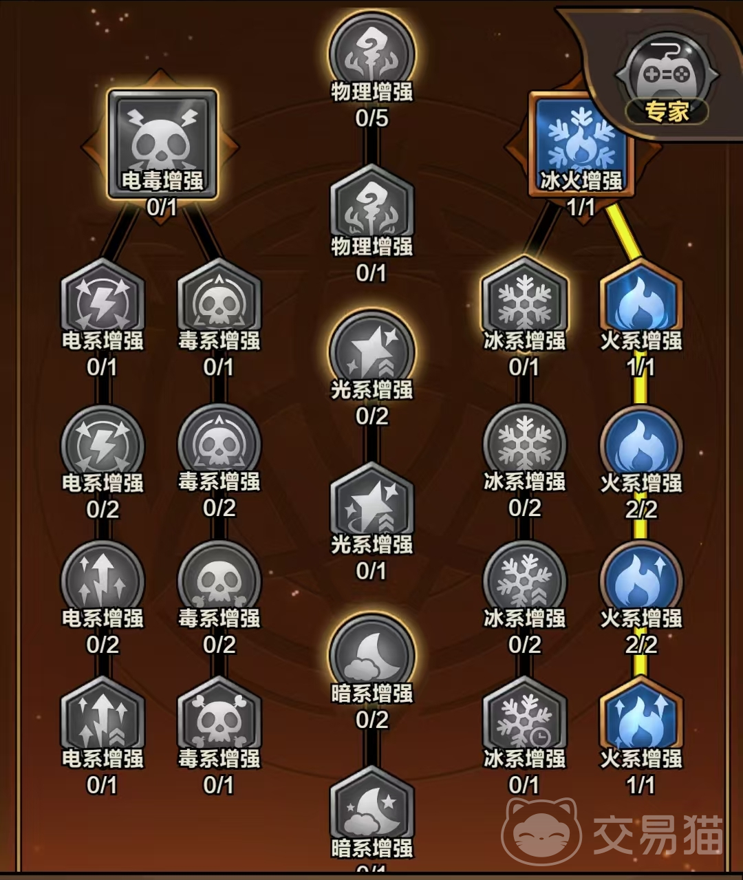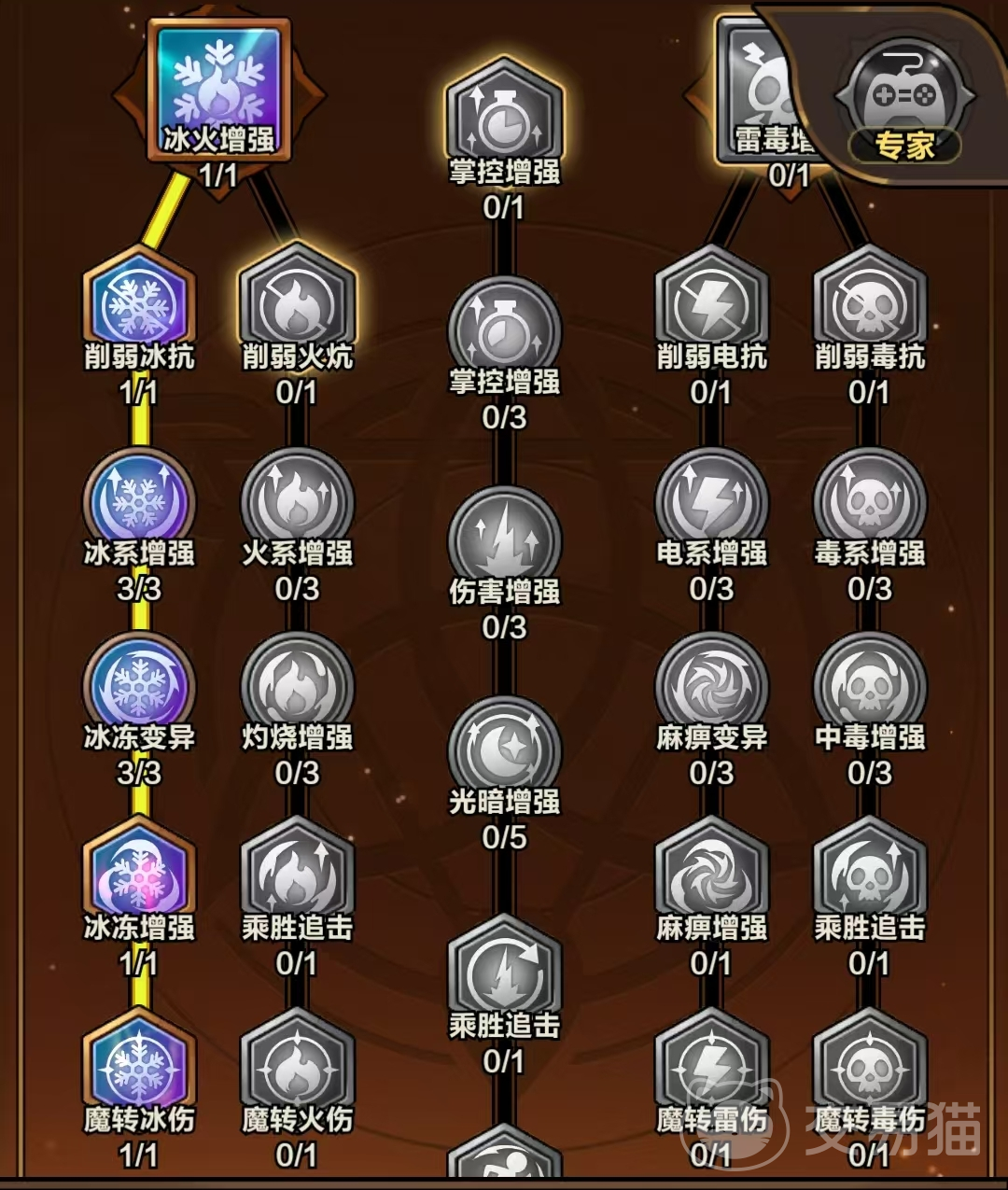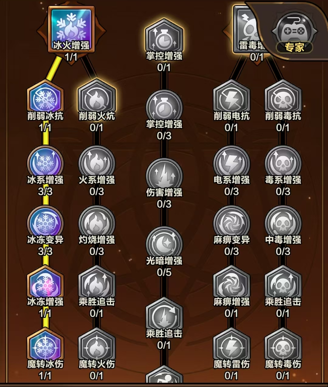 火、电、毒、冰四系玩家需激活对应元素分支中的增伤与特效强化节点;光、暗、魔法弹三类技能使用者仅需贯通中央列天赋,该路径提供跨元素通用的施法速度、暴击率与能量转化率加成。本模块完成后,立即返回【防御专精】补全白色区域,剩余点数可根据实战反馈自由调配。