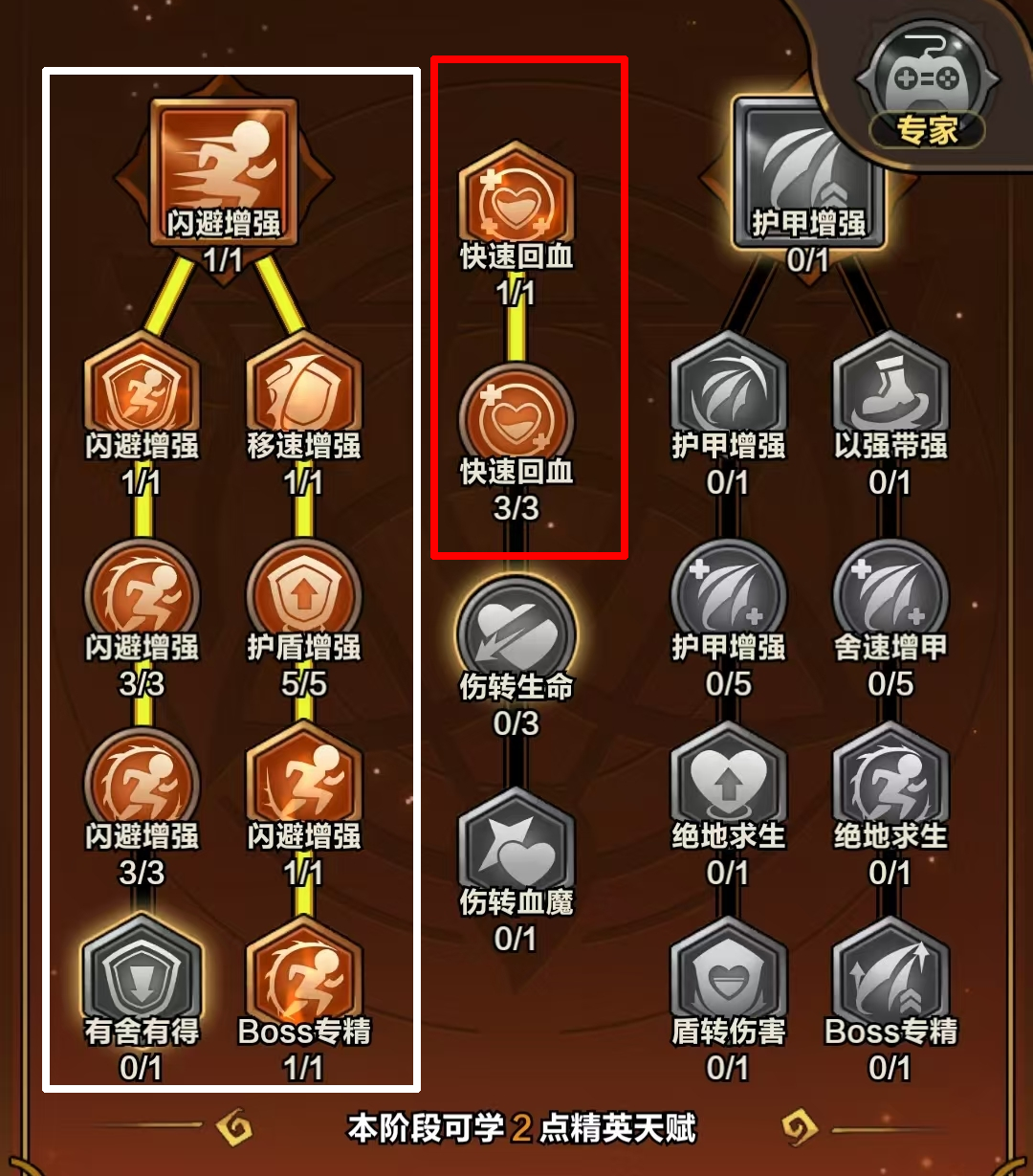首优目标为中间【快速回血】节点,保障基础生存续航能力。白色区域全部延迟处理,点数优先注入【元素专精】必要节点。待该模块关键天赋激活完毕后,再回填防御侧空白。若实际战斗中承伤压力超出预期,可追加投入【伤转生命】以增强反伤转化效率。