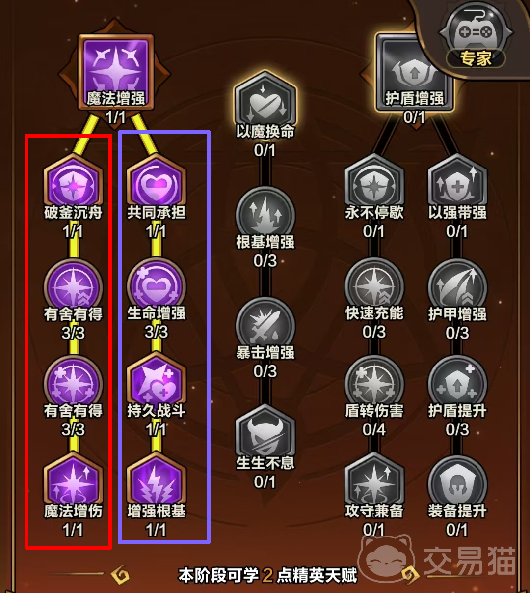 核心路径聚焦中间红色区域全点满。左侧白色区域暂不分配点数,待中期完成【魔法天赋】最左列全部节点后再开启补点。若后期资源紧张,可将中间底部三项天赋回退,将点数集中投向提升魔法值上限与恢复效率的关键节点,确保技能循环持续性优先于次要属性加成。