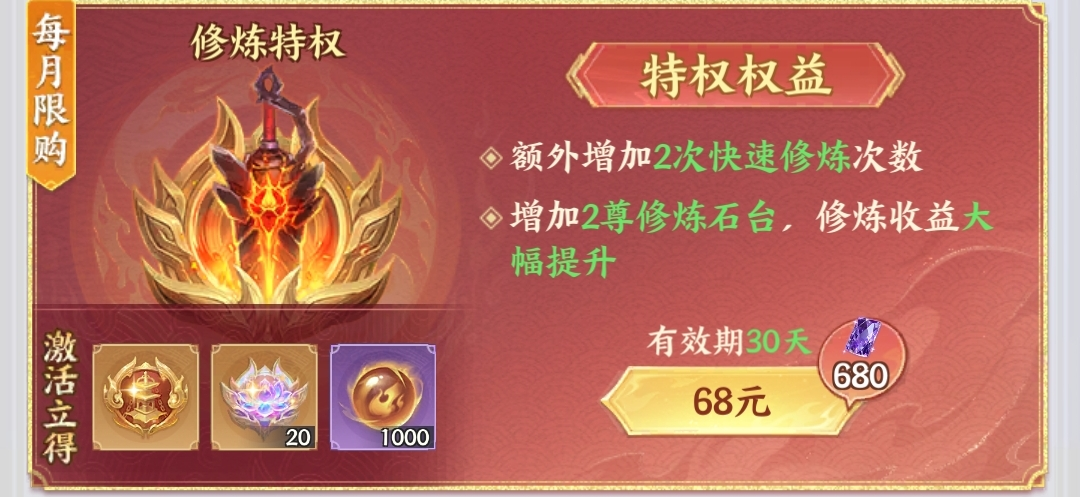售价68元,持续30天,提供额外2次快速修炼机会,并即刻获得2尊石台强化修炼产出。另含1枚【结盟誓令】、20枚【征召玉兆】、1000枚【破境丹】及680张【紫晶卡】,资源转化效率优异。