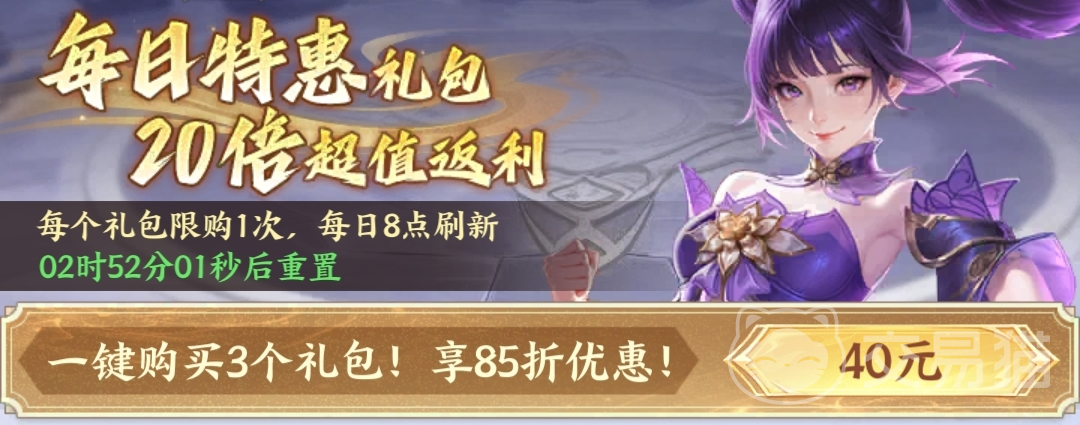 含1款免费礼包与3款付费礼包,一次性购齐3款付费礼包享85折优惠,折后总价40元。每日08:00刷新购买次数。