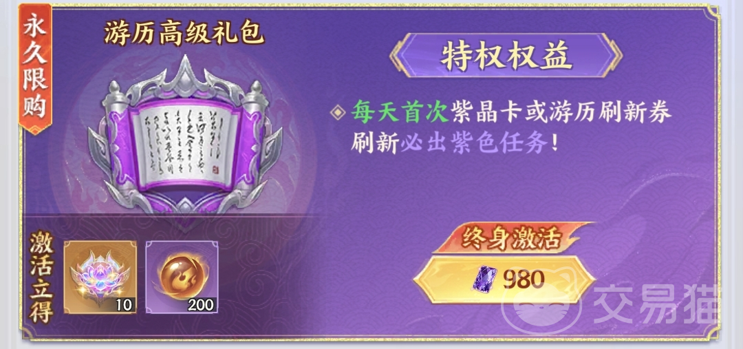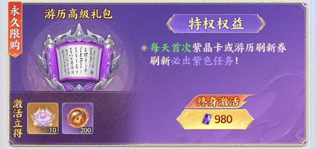 消耗980张【紫晶卡】购得,生效后每日首次刷新游历任务必出紫色品质任务。额外赠送10枚【征召玉兆】与200枚【破境丹】。理论回本节点为完成9次产出【紫晶卡】的紫色游历任务,全玩家优先推荐配置。
