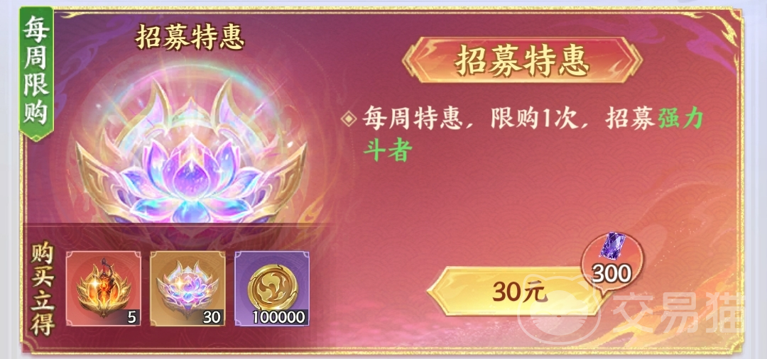 售价30元,持续7天,每周限购一次。提升高品质斗者获取概率,附赠5枚【结盟誓令】、30枚【征召玉兆】及300张【紫晶卡】。综合性价比突出,属刚性需求型特权。