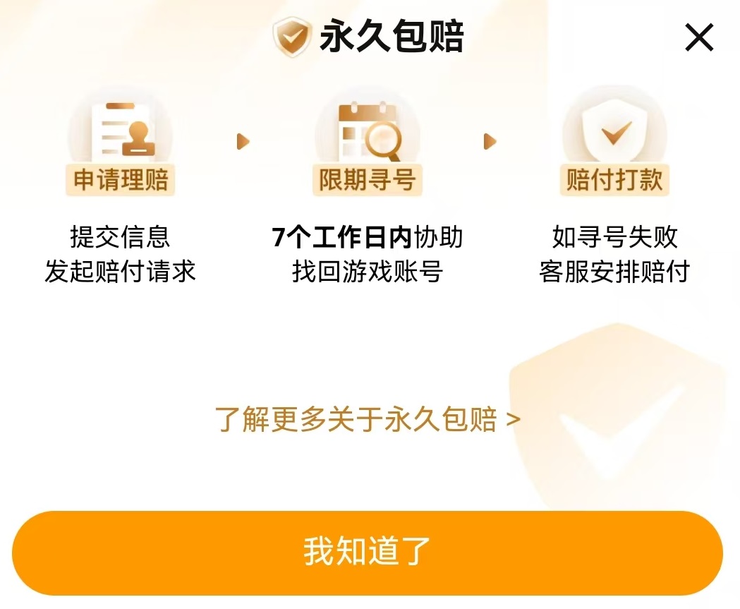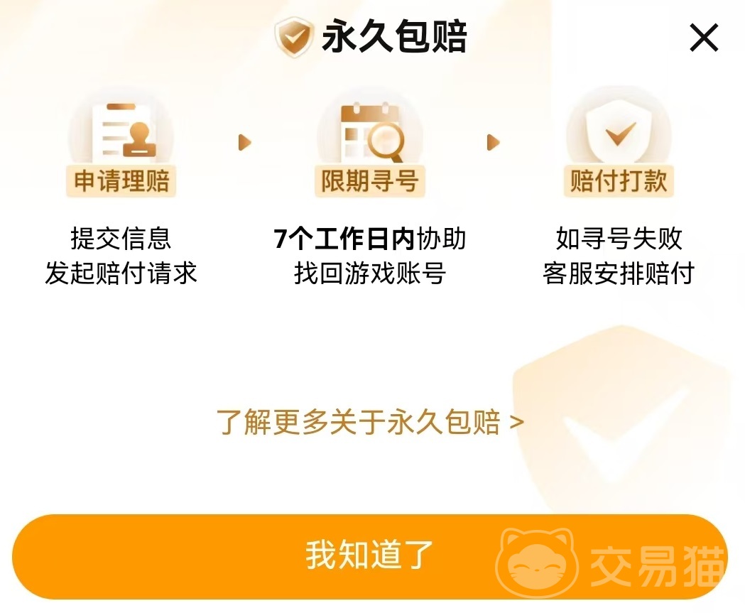 如果大家在这里进行的是成品号交易,那么交易猫直接做到了成品号永久包赔全覆盖。这些账号中都带有赠永久包赔标签,只是在额度方面有所区别。直接在筛选中选择全额永久包赔就可以找到这一类型商品,只要出现找回盗号等情况,会全额进行赔付,根本不用担心各种意外的发生。