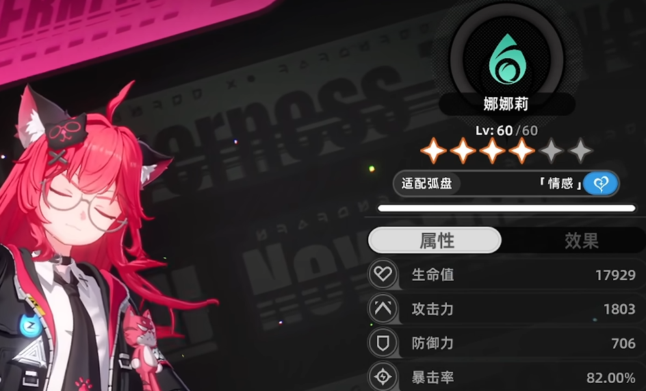 第二位成员娜娜莉担任队伍主C。该角色在历次测试中均为限定UP池常驻,预计正式上线后仍将保持限定获取方式。属性面板显示其拥有突出的生命值与攻击力成长,且暴击率基础值达82%,即使未激活命座也远超同类输出角色平均水平。其核心输出模式依托技能开启后的驻场状态与大招爆发,全程强调高频、集中的伤害投射。弧盘推荐选择《预备备》,提供百分比攻击力加成并附带攻击增益效果;空幕则锁定《森林萤火之心》,专精于驻场期间的持续爆发输出。词条配置首选暴击率与暴击伤害,其次可补充攻击力百分比,三者协同可最大化其高暴击基础下的实际收益。
