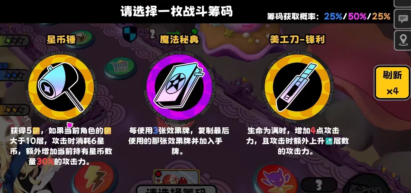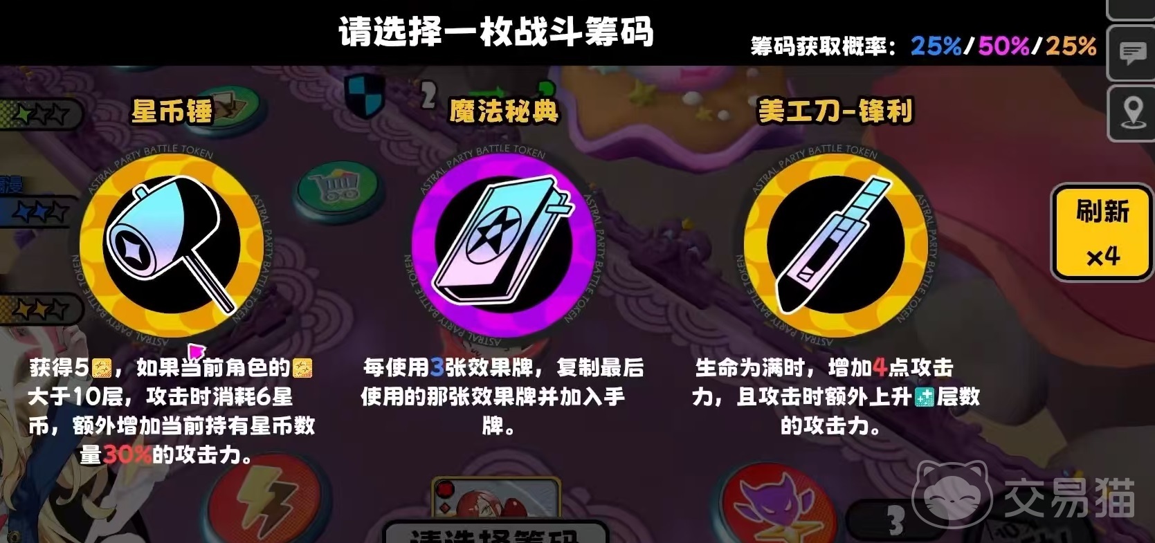 筹码按品质划分为蓝、紫、金三档,对应基础、进阶与顶级层级。其刷新概率与玩家当前所处的星阶强绑定:低星阶段蓝色筹码出现率超65%;中星阶段紫色成为主流,金色概率升至20%;进入高星后,金色筹码刷新率显著提高,成为主力获取目标。