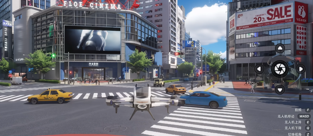 启动无人机操作极为便捷:只需点击屏幕右上角的【无人机】图标,即可切换至空中视角。进入该模式后,玩家可自由调节飞行高度,并通过方向键实时转动镜头角度,实现多轴向构图控制。