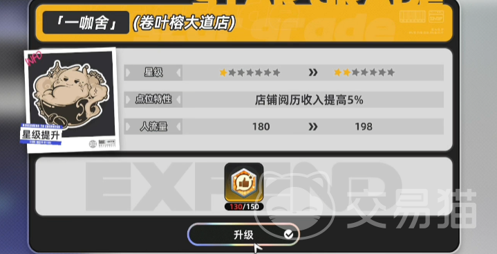 所有上架商品均支持实时替换与等级升级。当库存告警(如咖啡店提示咖啡豆、糖、面粉等原材料不足)时,须及时执行补货指令,维持供应链稳定。此外,界面左上角设有星级标识,点击可进入店铺升级模块,通过投入资金与材料提升整体盈利能力、客流量上限及营收倍率。