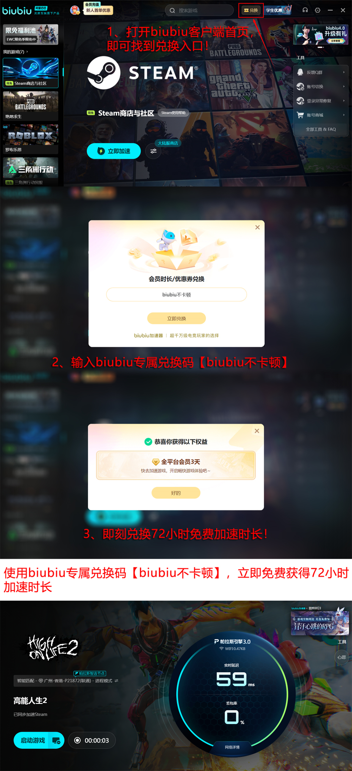 新用户注册后无需充值即可启用加速服务,首单自动赠送24小时免费使用权限。另提供通用兑换码【biubiu不卡顿】,可额外激活72小时加速时长,每位账号限用一次。两项权益叠加后,新用户总计可获得96小时无门槛试用周期,便于充分测试游戏运行状态与网络兼容性。