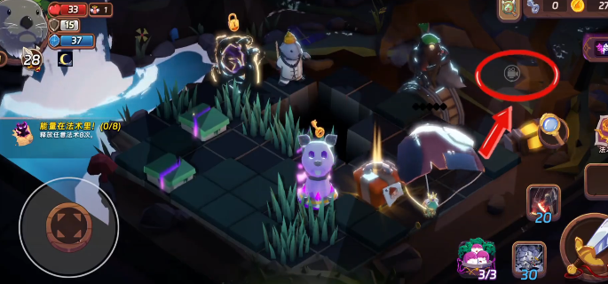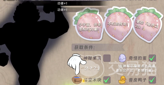 最后一项“神秘的果实”仅在大灰狼专属关卡中生成,且位置具有隐蔽性。该果实不会在常规视角下直接显示,需玩家主动调整镜头:点击屏幕右上角的缩放控制按钮,将视野切换为广角远距模式,即可在场景高处平台边缘发现该物品。其外形呈半透明蓝紫色球体,与前三者视觉风格差异显著,辨识度较高。确认位置后,直接触控即可完成拾取。