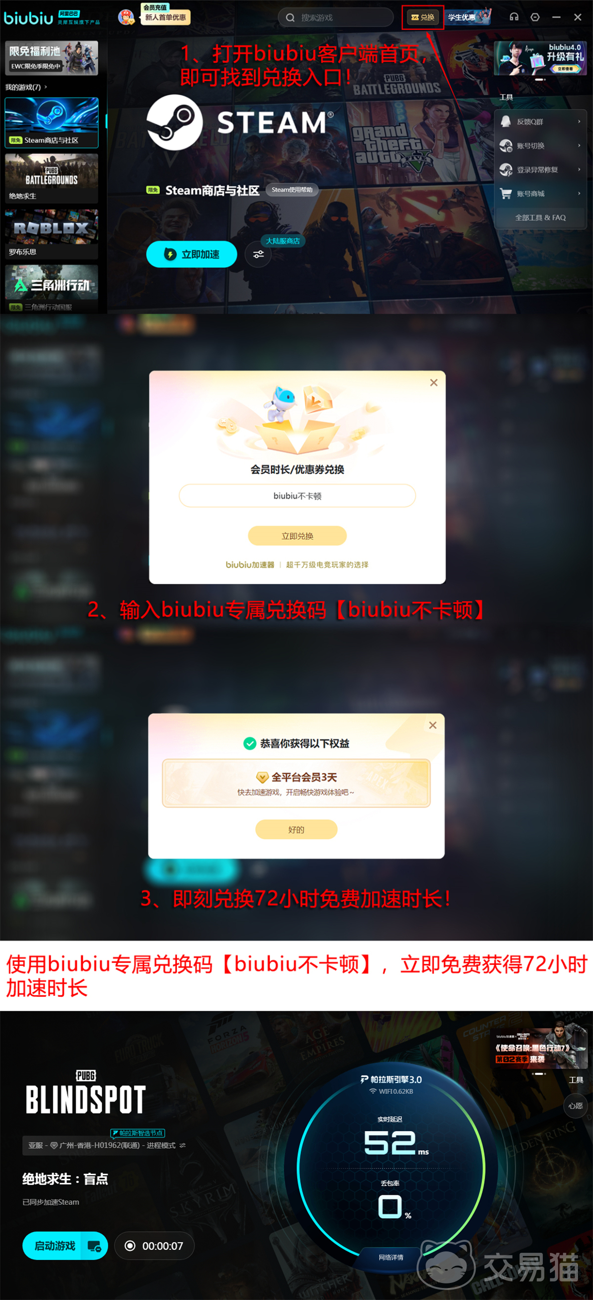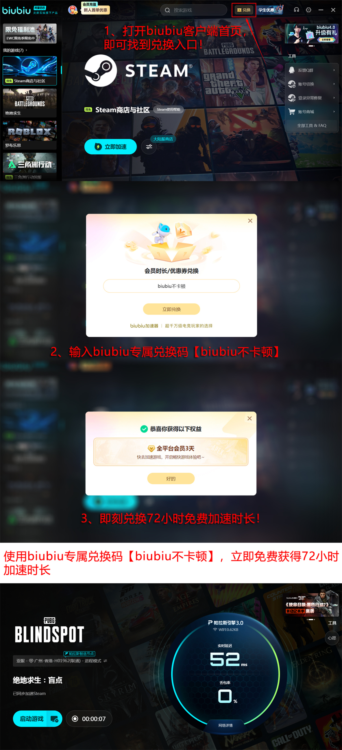 目前《绝地求生:盲点》本体完全免费,无需付费即可完整体验全部模式与角色。配套网络优化工具同步提供新人专属权益:完成账号注册后,可立即获得24小时全游戏加速权限;另附赠一次性兑换码【biubiu不卡顿】,激活后额外增加72小时使用时长。两项福利叠加,新用户总计享有96小时无限制加速服务,便于深度验证其实际优化效果。