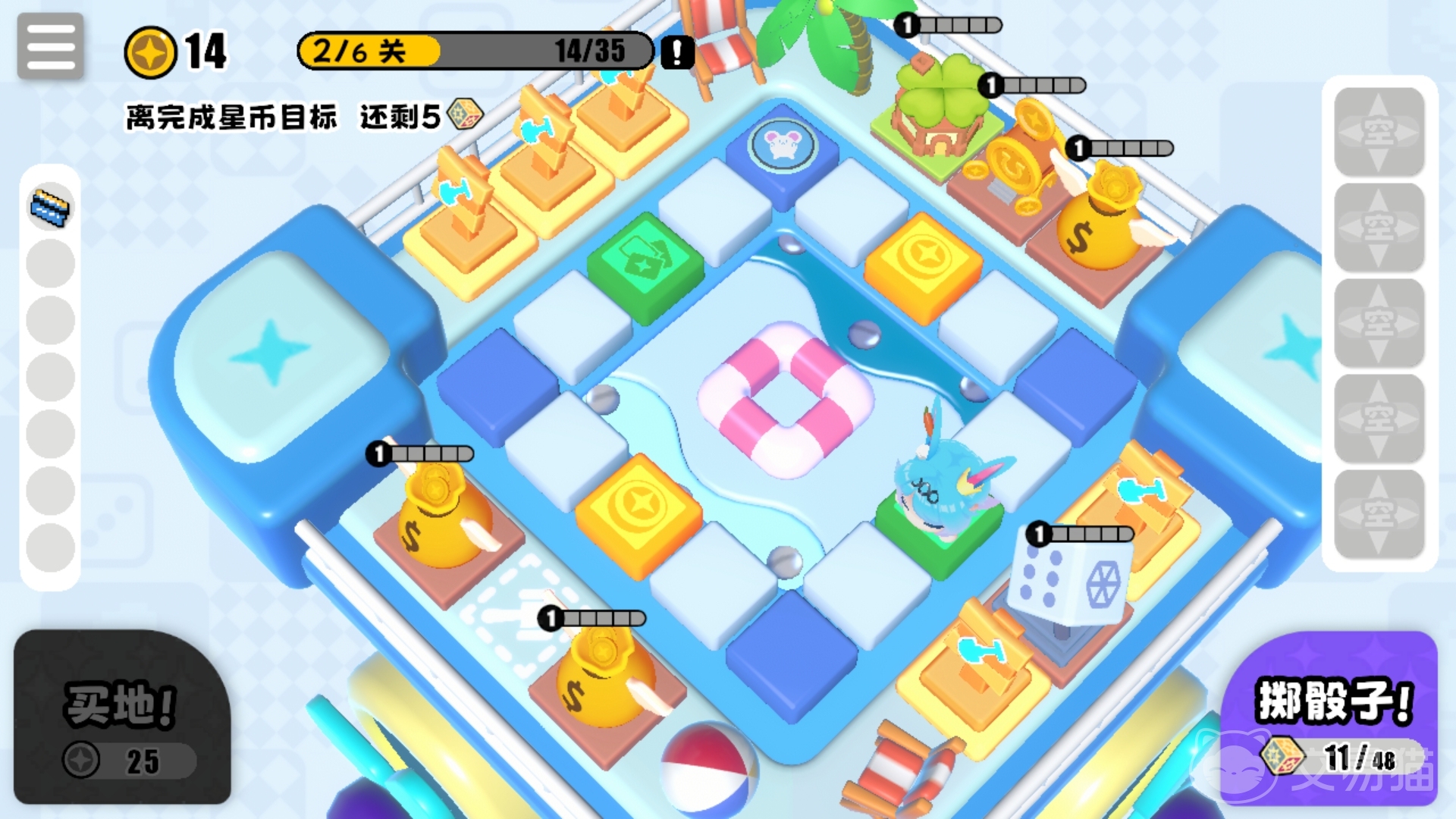全新策略经营玩法,采用掷骰行进+地块建设模式。玩家通过投骰决定移动格数,在空置地块购买产权,并建造餐厅、工坊、驿站等功能建筑,从而触发收益、事件或增益效果。关卡目标明确:每关须累计达成指定数量“星币”方可通关,考验资源规划与长期运营能力。