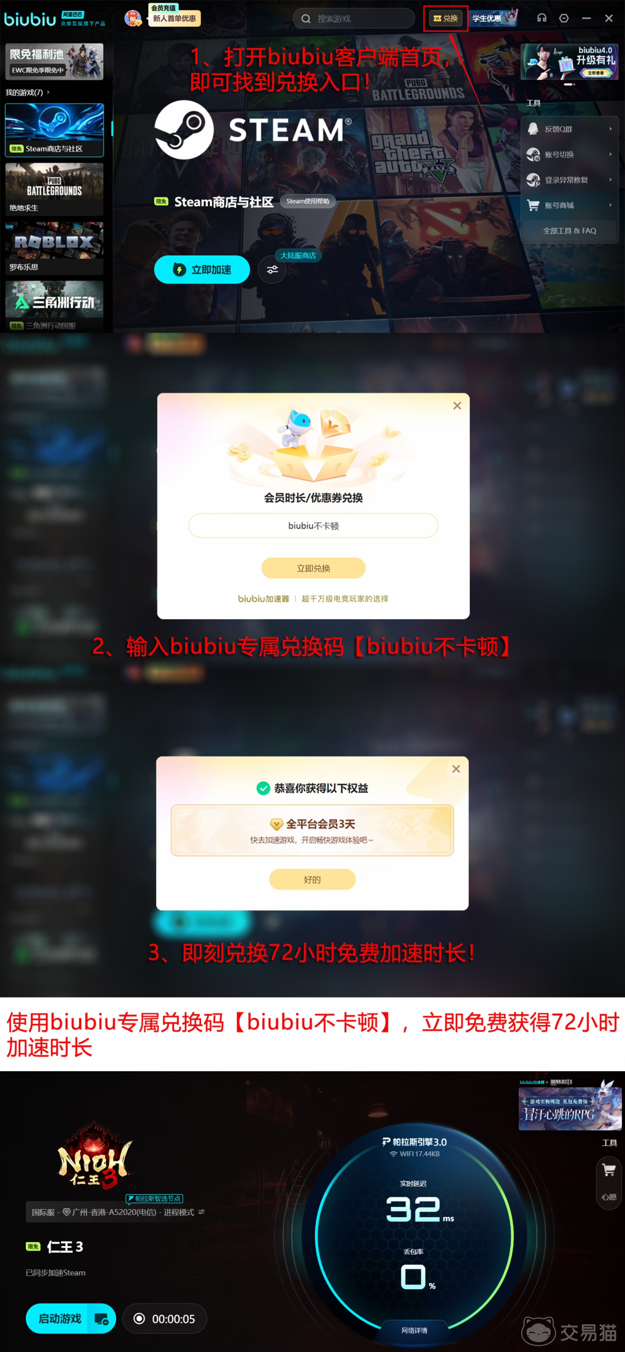 biubiu加速器采用会员订阅制服务模式。新用户注册后可直接获得24小时全功能免费试用权限;所有注册用户均可凭口令【biubiu不卡顿】兑换额外72小时加速时长,即新用户最高可享累计96小时无门槛加速服务。此外,平台还面向在校大学生及回归老用户提供定向优惠方案,具体政策可联系官方客服获取详情。