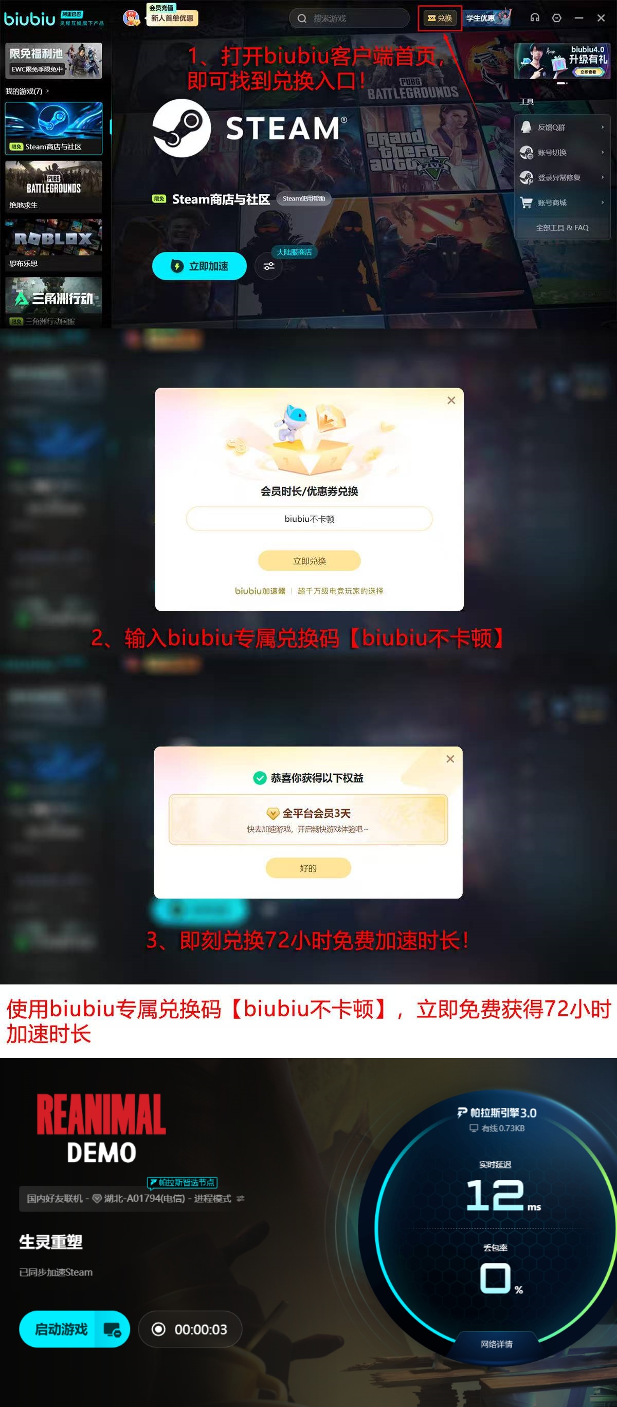 新注册用户首次登录biubiu加速器可自动获得24小时全功能免费加速权益;输入专属兑换码【biubiu不卡顿】,还可额外领取72小时连续加速服务,无需绑定支付方式即可生效。