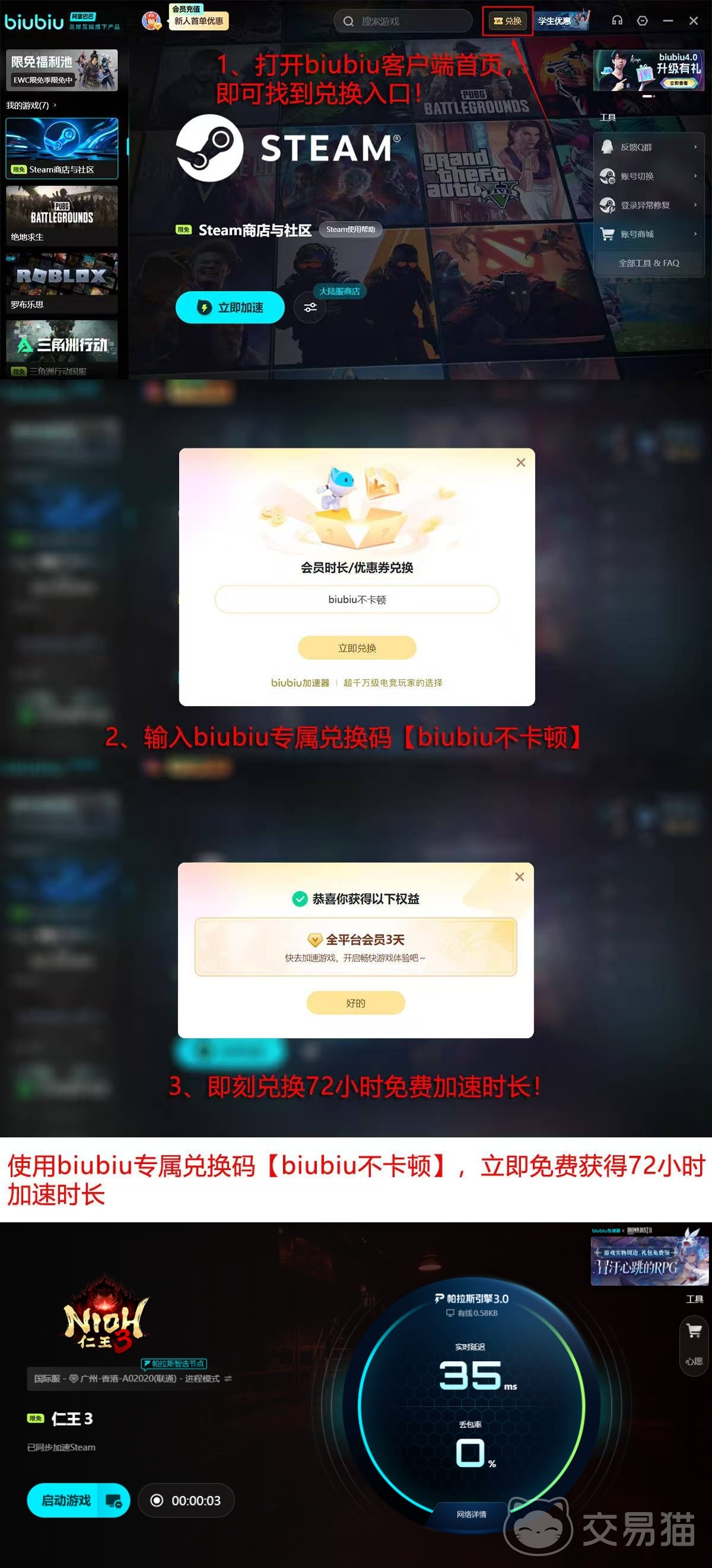 新用户完成注册并登录后,可立即获得24小时免费加速时长;另可通过输入兑换码【biubiu不卡顿】额外领取72小时服务。两项权益叠加后,总计可享96小时加速权限,充分满足深度体验需求。