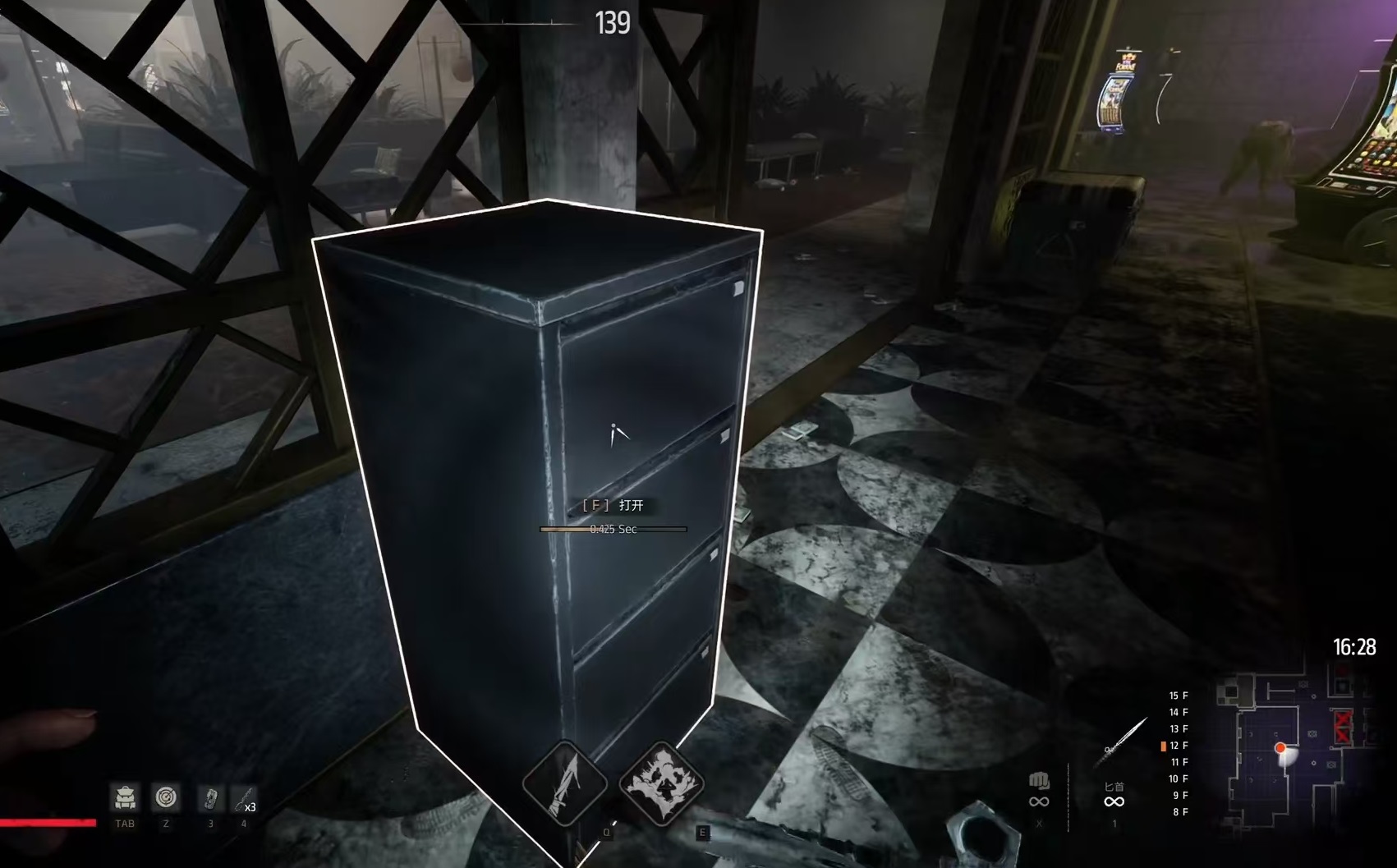 游戏内小保险箱分为两类:一类为无锁型普通小保险箱,可直接交互开启;另一类则位于红卡房或蓝卡房内部,需对应钥匙方可解锁。高频刷新区域集中在7楼与3楼:7楼电梯口及左下角房间属于稳定高产点,常出现关键道具;3楼则呈多点随机分布,是补充蓝卡与基础钥匙的重要来源。此外,其余普通楼层的独立房间中亦存在较低概率刷新的小保险箱。
