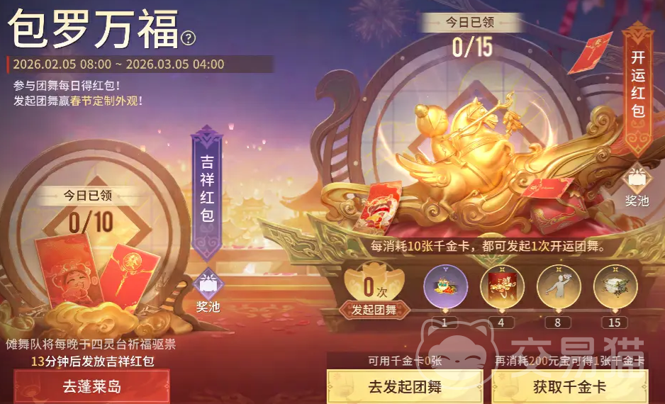 “纵马觅珍”为福袋抽取类玩法:玩家可通过新春签到或商城购买获取福袋,开启后随机获得瑞玉宝箱、神佑宝灯等常规物资;特别提示,存在概率获得马年限定神品遗珍,具备唯一收藏属性。第五项“游园觅影”需前往无拘地图,定位5处或10处戏影灯点位,每处均可领取瑞玉宝箱×1及神佑宝灯×1,强调探索互动性。