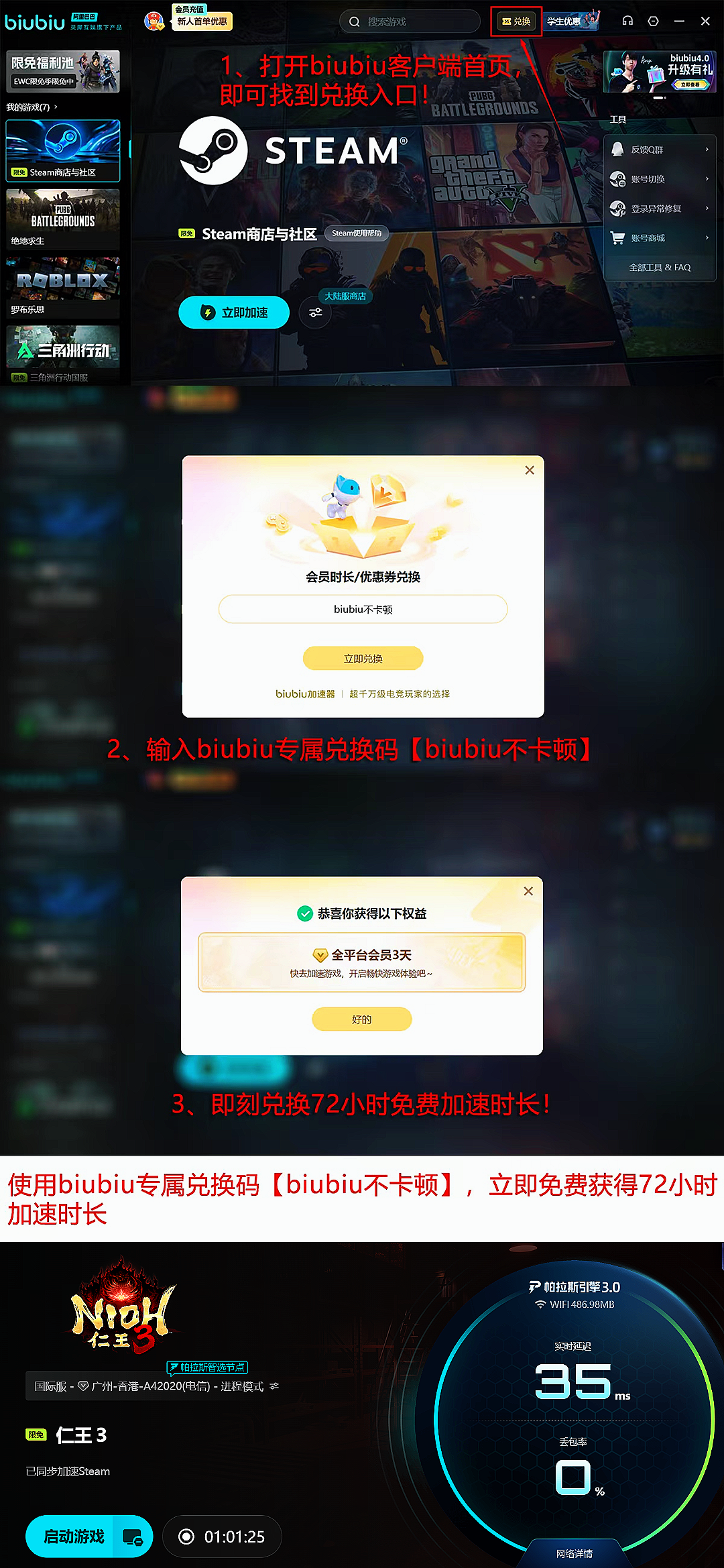 当前平台开放限时福利:输入兑换码【biubiu不卡顿】,所有用户可获赠3天免费加速时长;新注册用户完成身份验证后,额外解锁24小时专属加速权益,累计最高可享96小时免费使用额度。