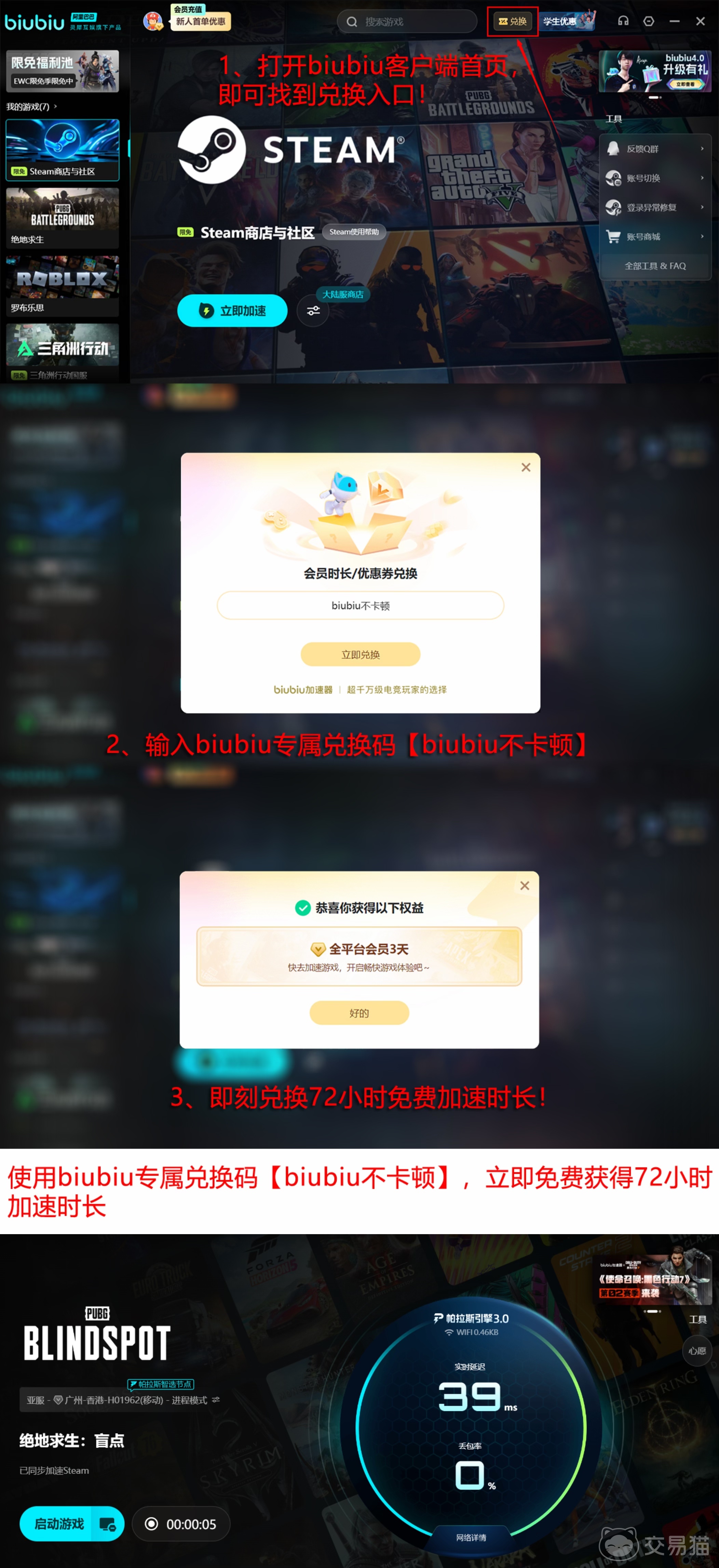 除基础加速功能外,当前版本还推出限时福利活动:已注册用户输入口令【biubiu不卡顿】即可领取3日全游戏加速权限;新注册用户额外获赠24小时加速时长。