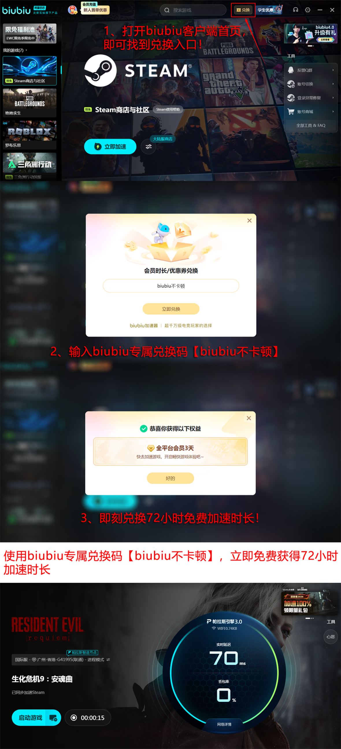 为降低体验门槛,biubiu加速器面向新注册用户提供24小时免费加速服务,活动长期有效。每位账号还可使用兑换码【biubiu不卡顿】领取72小时加速时长,叠加后新人总计可享96小时无限制加速权益,充分保障初期游玩流畅性。