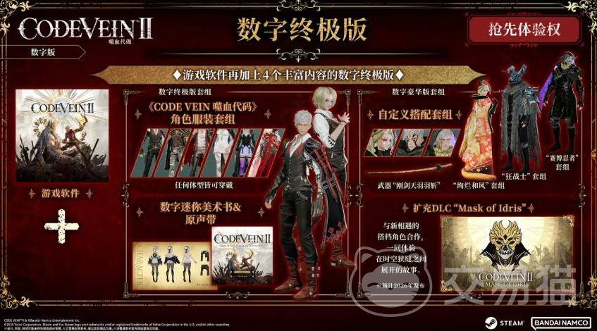 《噬血代码2》终极版定价为468元,当前限时优惠价为421元。该版本并非简单叠加内容,而是整合了本体游戏、限定数字内容、前作联动资源及早期体验权益在内的完整包。具体包含六大部分:第一,完整游戏本体;第二,自定义套装包,含三套独特外观与专属武器;第三,扩充DLC“时空狭缝”——该独立剧情将于2027年1月上线,非首发即送;第四,前作角色主题服装套组,涵盖伊奥、路易等共6款经典造型;第五,数字迷你美术集与官方原声音乐集;第六,预购专属福利:提前三天解锁游戏,并额外获得孤狼双剑及对应彩绘造型。