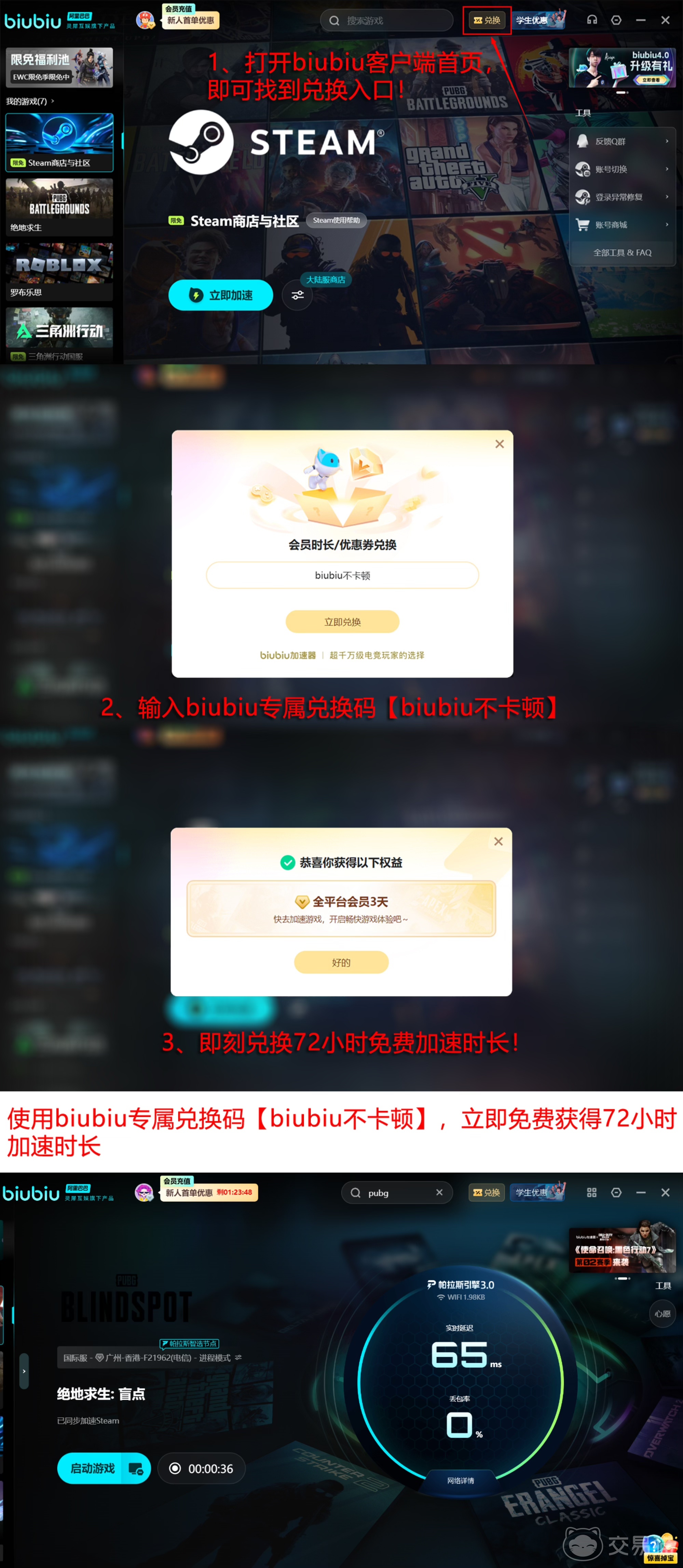 新用户完成注册后,可立即获得24小时全功能试用权限;所有用户输入通用兑换码【biubiu不卡顿】,即可额外领取72小时加速服务,覆盖首周高频使用周期,有效规避因网络波动导致的操作延迟与同步异常。