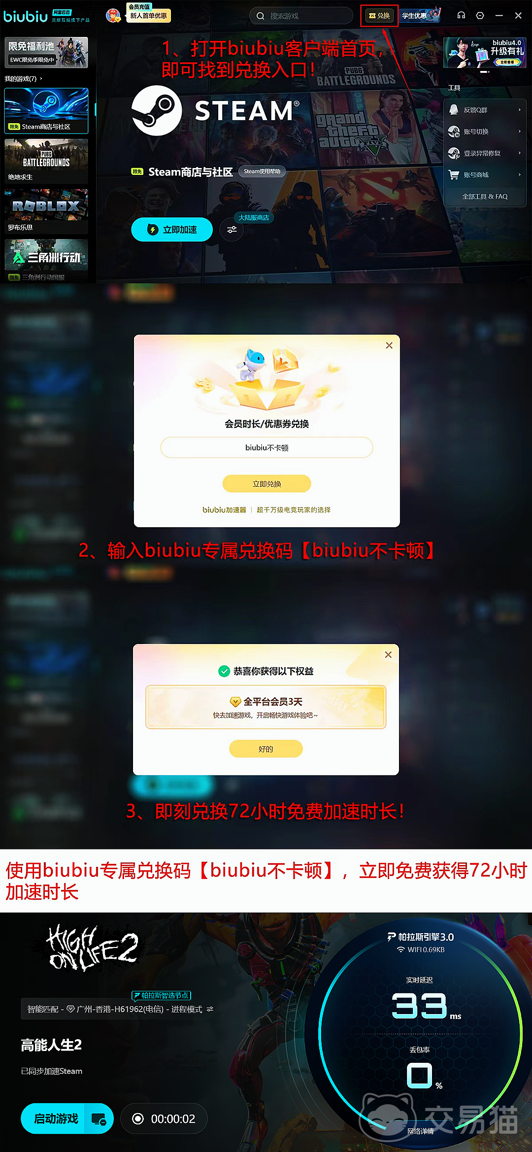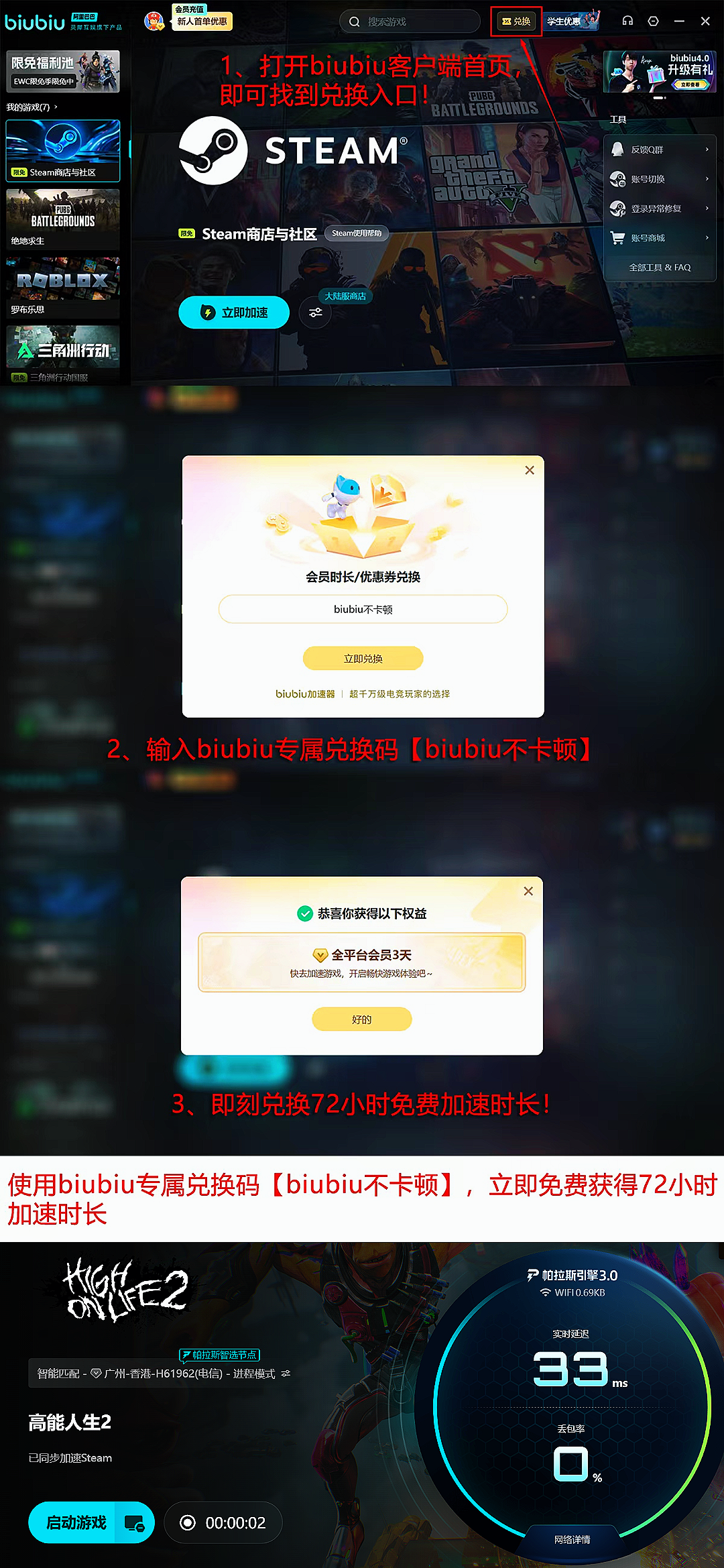 新用户完成注册后可立即获取24小时全游戏免费加速服务;所有用户输入兑换码【biubiu不卡顿】,还可额外获得3天加速时长。两项权益叠加后,新用户总计可享96小时免费加速体验。