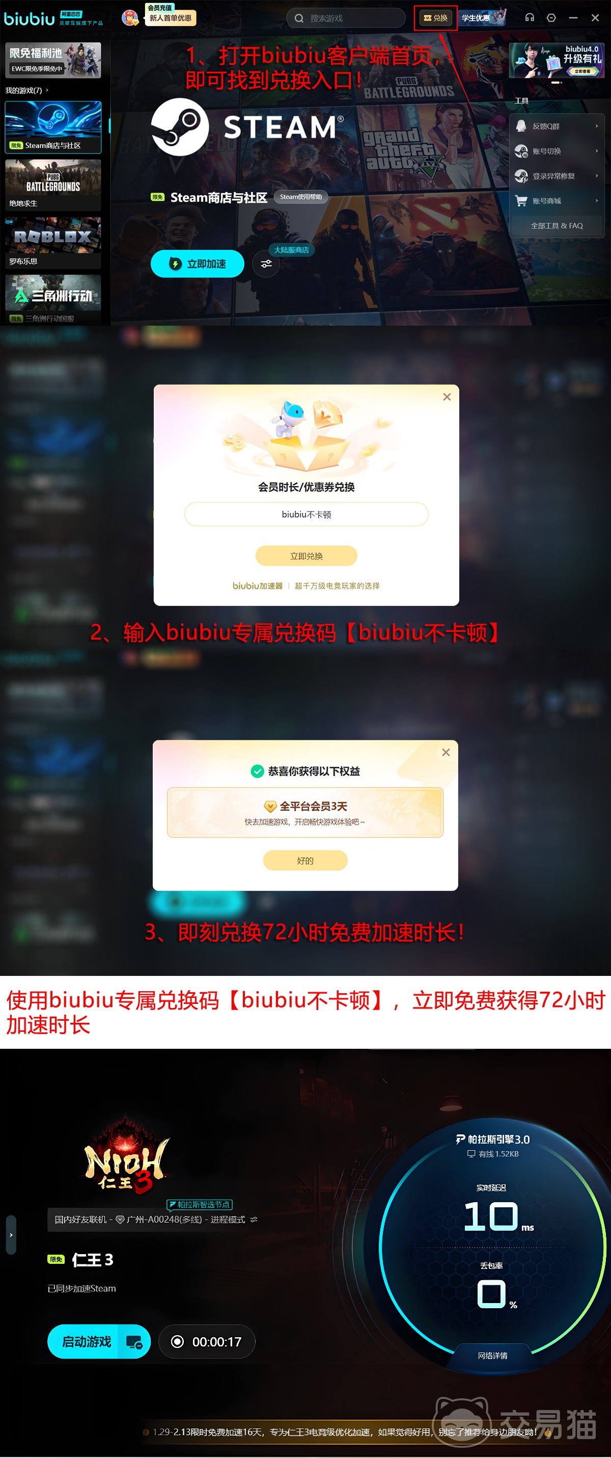 新用户注册biubiu账号即可获赠24小时免费加速时长;另可通过兑换中心输入激活码【biubiu不卡顿】,额外领取72小时加速服务。总计96小时稳定加速支持,覆盖新手开荒、Boss机制熟悉及多人协作全流程,大幅降低因网络波动导致的操作失准风险。
