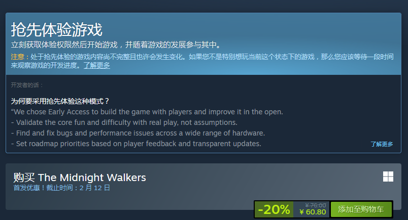 《午夜行者》采用一次性买断制,目前国区标准售价为76元,首发期间享有20%限时优惠,折后仅需60.8元。该折扣有效期至2026年2月12日,此后将恢复原价。对于计划体验本作的玩家而言,当前是性价比最高的购入窗口期。