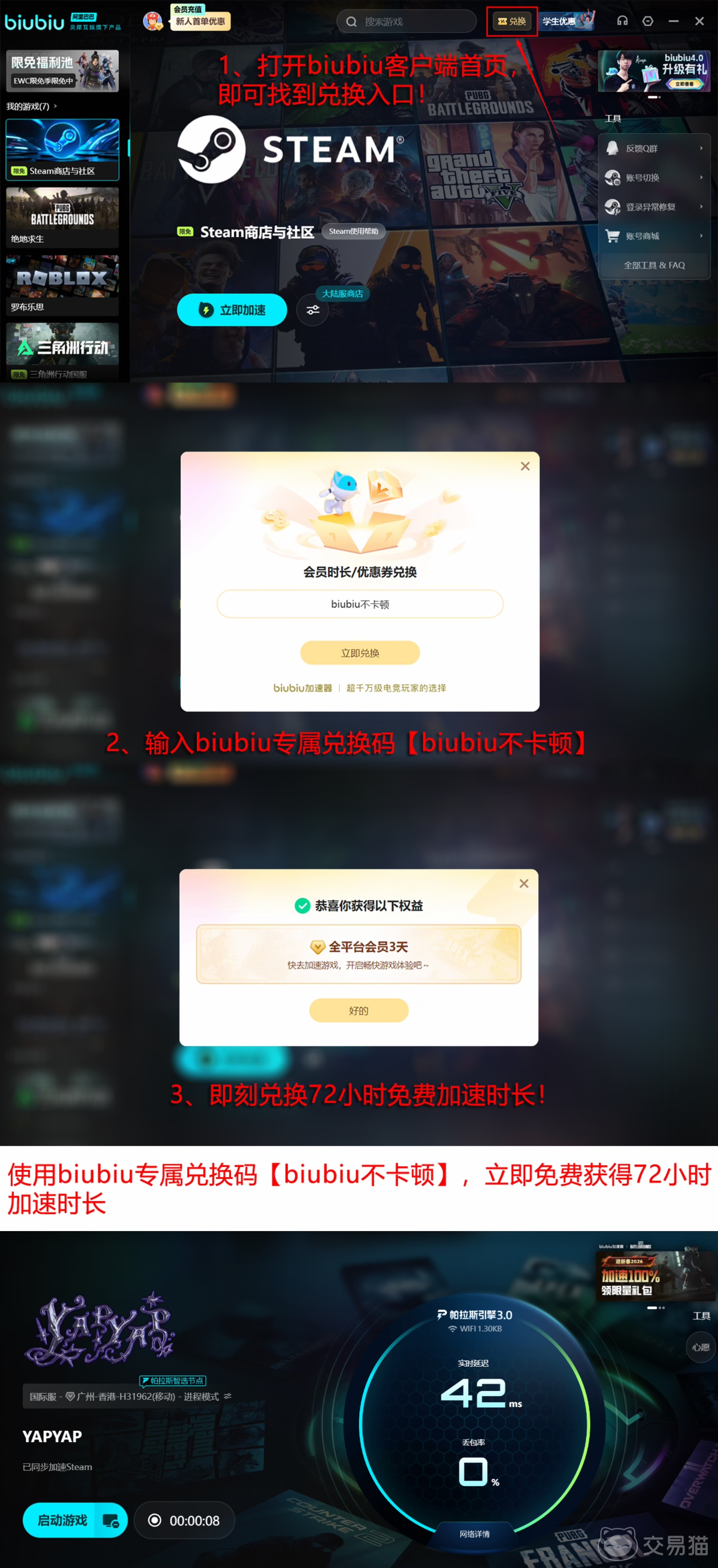目前biubiu加速器开放限时体验通道。输入口令【biubiu不卡顿】即可领取3天全游戏加速权益,所有注册用户均可使用一次;新用户额外获赠24小时专属加速时长,无论账号注册时间早晚均适用。