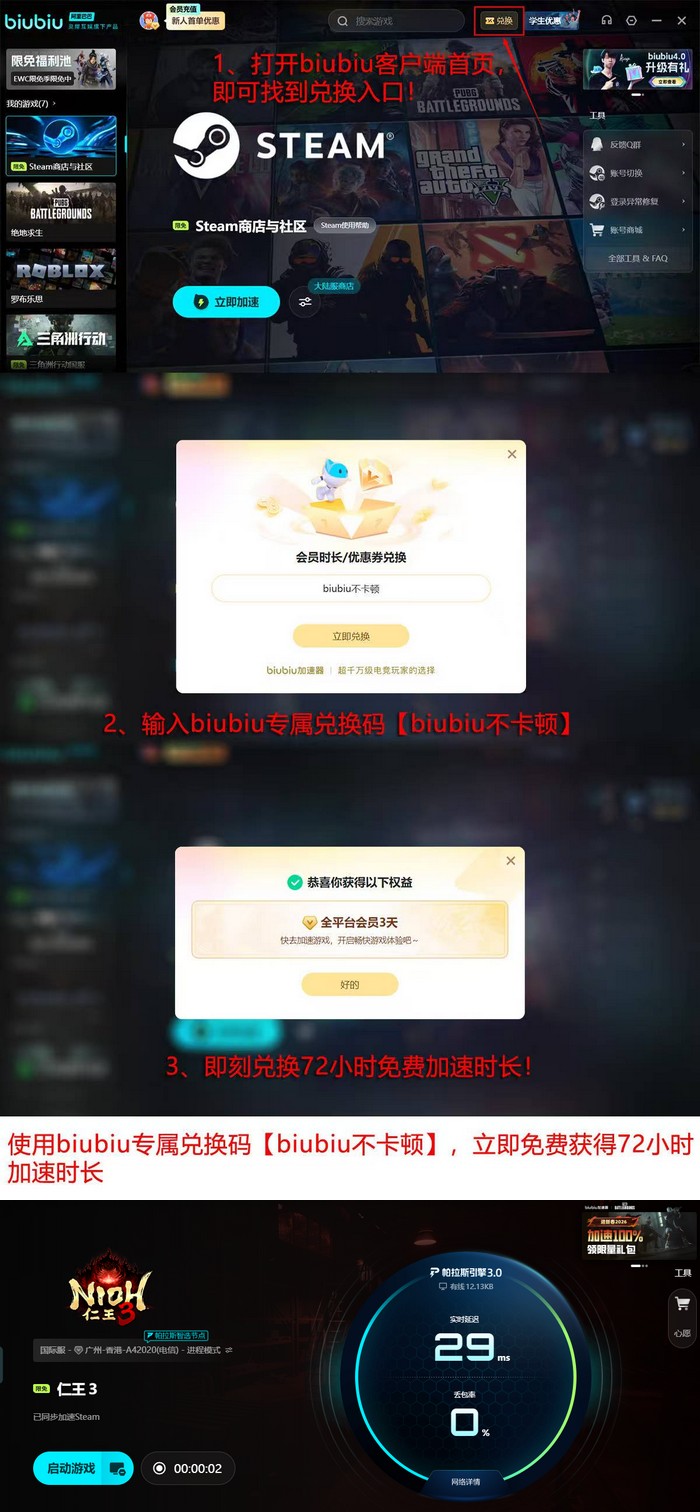 需注意,《仁王3》标准数字版安装包体积达125GB,建议预留充足存储空间与稳定网络环境。若下载过程中出现速度缓慢或连接异常,可借助网络优化工具提升体验。该工具近期完成架构升级,采用自研帕拉斯引擎3.0技术,显著优化大型文件下载与更新效率;同时由知名电竞选手xdd参与实测调优,确保多场景稳定性。新用户注册即赠24小时全平台加速时长,叠加使用口令“biubiu不卡顿”还可额外领取3天会员权益,总计可享4天免费加速服务。