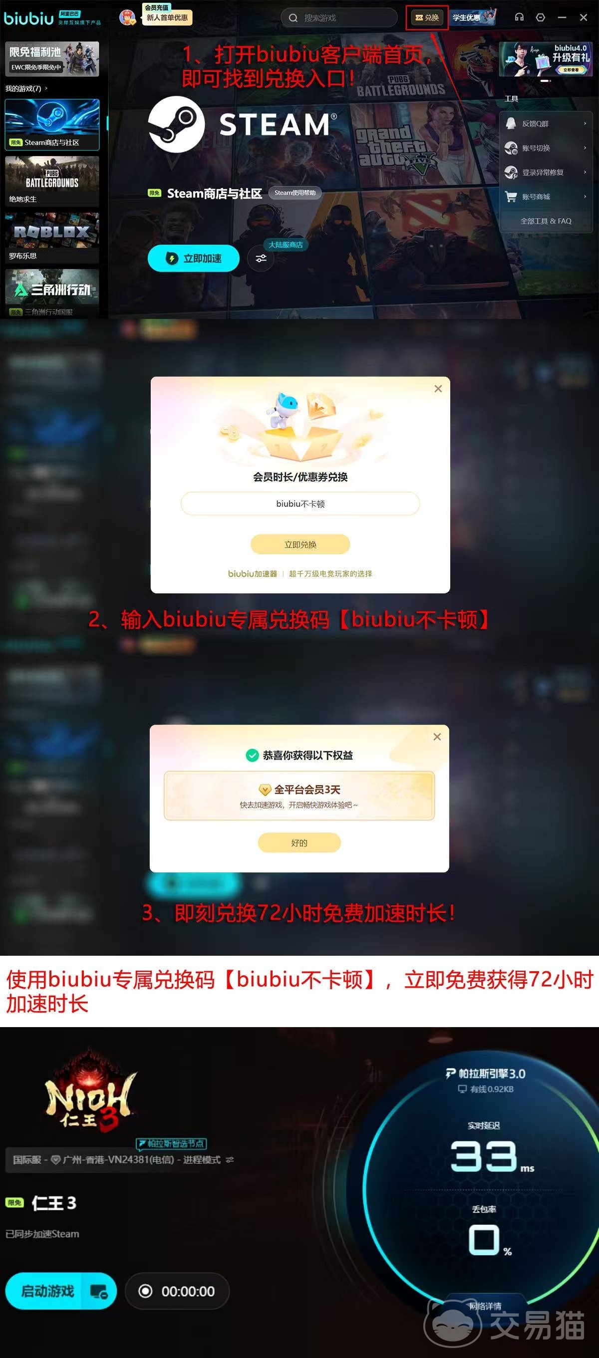 新用户注册后可即时领取24小时免费加速时长,用于测试不同服务器节点的实际效果。若需延长体验周期,输入激活码【biubiu不卡顿】,即可追加72小时服务权限,总计享96小时无限制加速支持。