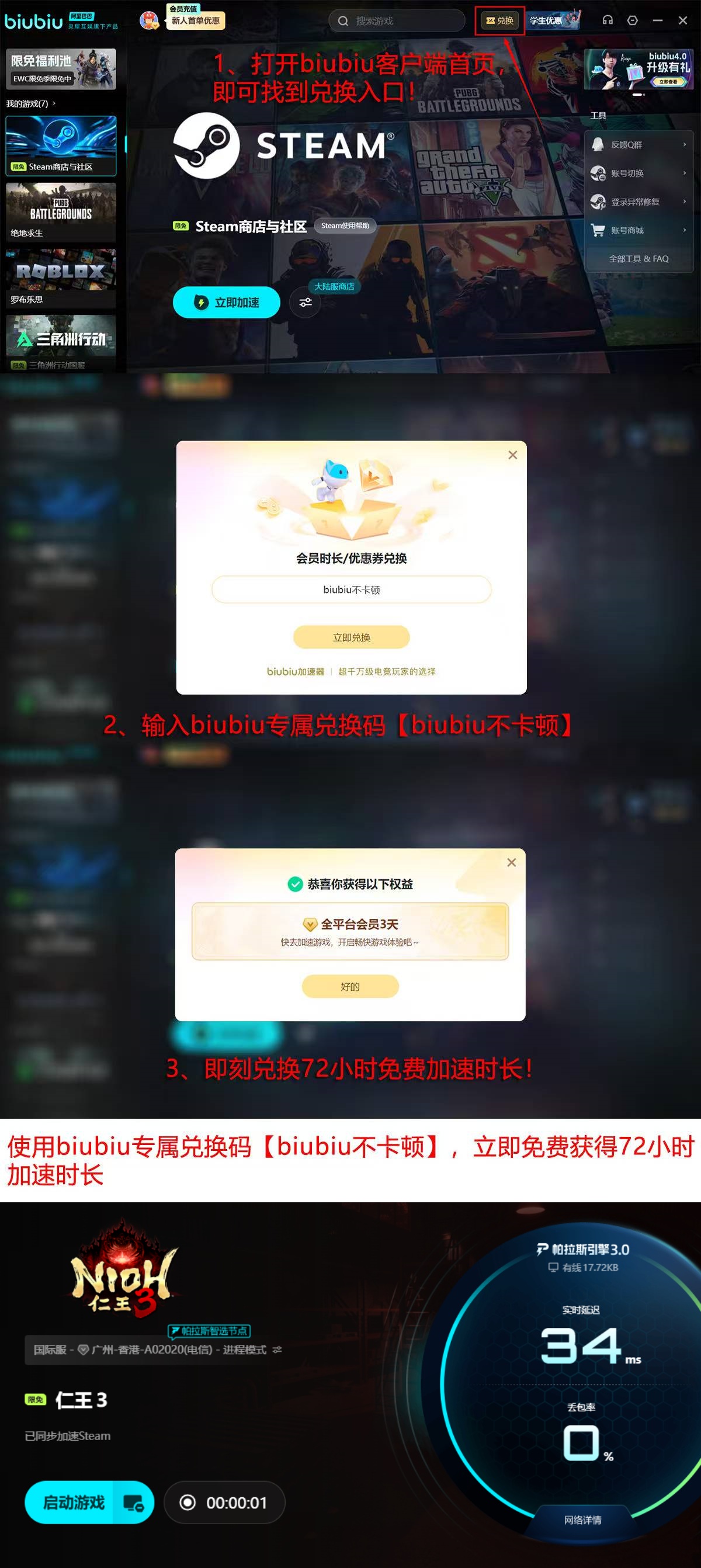 关于使用成本,新注册用户可直接获得24小时免费试用权限;若需延长体验周期,还可输入兑换码“biubiu不卡顿”,额外领取3天服务时长,总计享4天完整使用权。