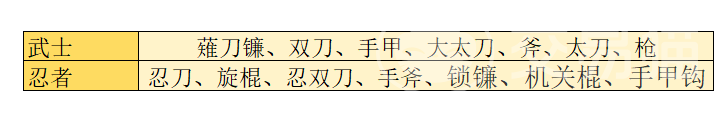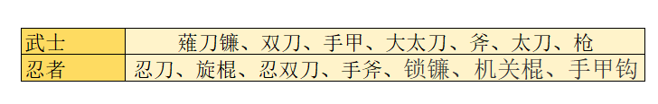 游戏内武器按战斗逻辑划分为两大体系:武士系与忍者系。