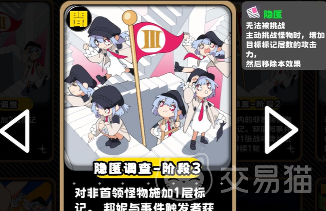 邦妮属于高策略型输出角色,定位偏向中前期节奏掌控与资源转化。其主动技能为“标记突袭”:可对场上任意一名怪物施加专属标记。被标记目标若被成功击杀,玩家将获得2枚星币(用于购买道具牌),同时触发“隐匿”状态——该状态包含双重效果:一是使邦妮自身攻击力永久提升3点(不可叠加,持续至本局结束);二是进入完全隐身状态,期间所有怪物均无法锁定或攻击邦妮。