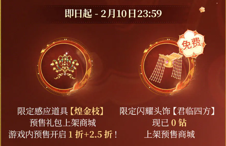 目前预售通道已开启,限定感应道具“煌金枝”已在游戏内商城上架。同步开放免费领取的限定闪耀头饰。版本更新后,玩家完成限时感应累计10次,即可直接获得“煌煌照重渊”套装中的首饰部件。