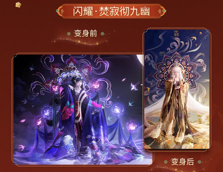 首批上线的两套限时闪耀套装为“闪耀·煌煌照重渊”与“闪耀·焚寂彻九州”。二者均内置“神树”“神女”双形态系统,每套含4个可独立穿戴的功能性部件。集齐任一套装后,即可激活双形态循环变身机制——仅需装备任意一件双形态部件,即可一键触发形态轮转动画;若装备外套部件并切换至冰霜形态,玩家可实时调节其表面冰晶覆盖面积;配套法阵背饰支持分区编辑,开放5组独立控制区域,通过缩放与显隐组合,最多生成31种差异化视觉效果。