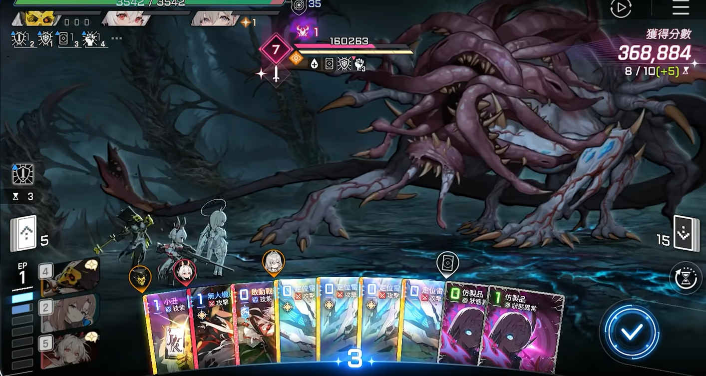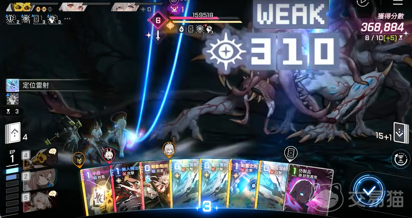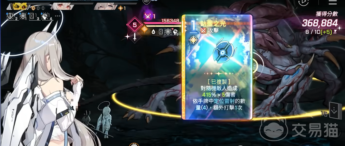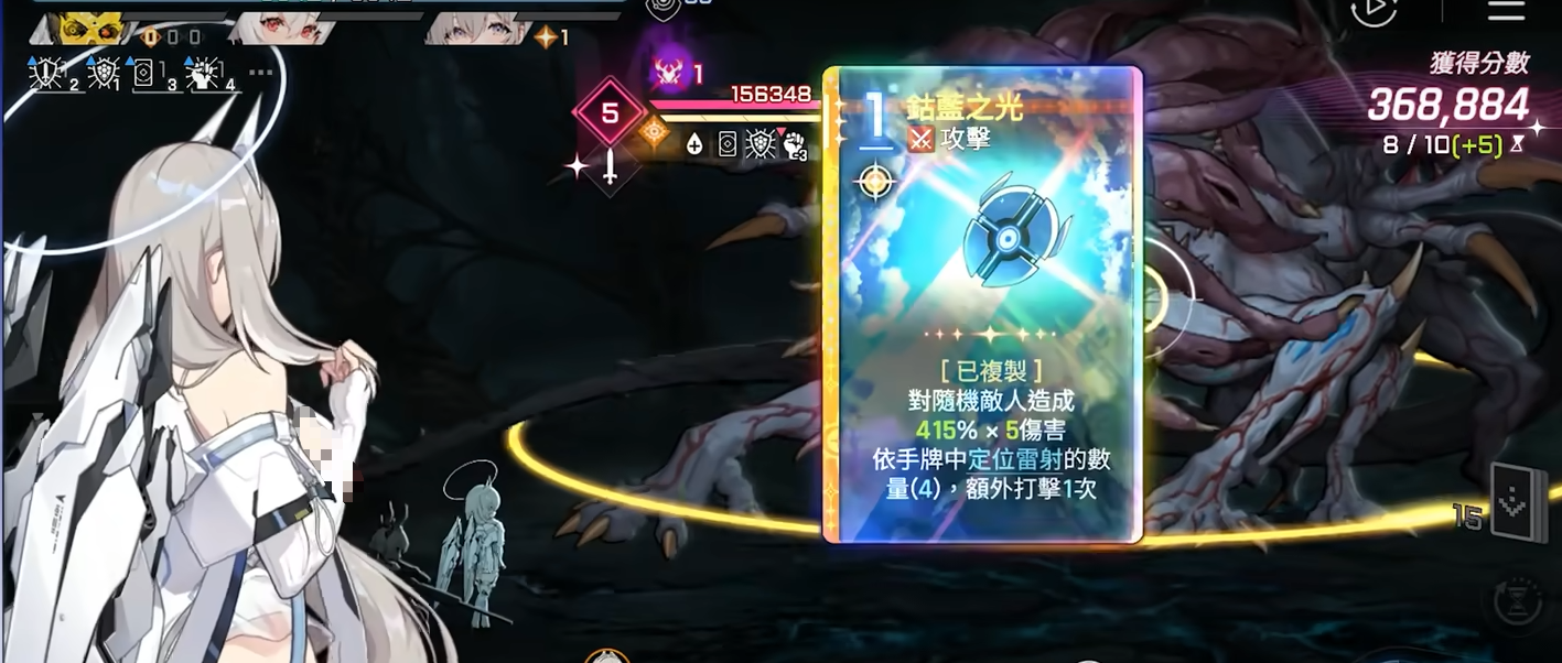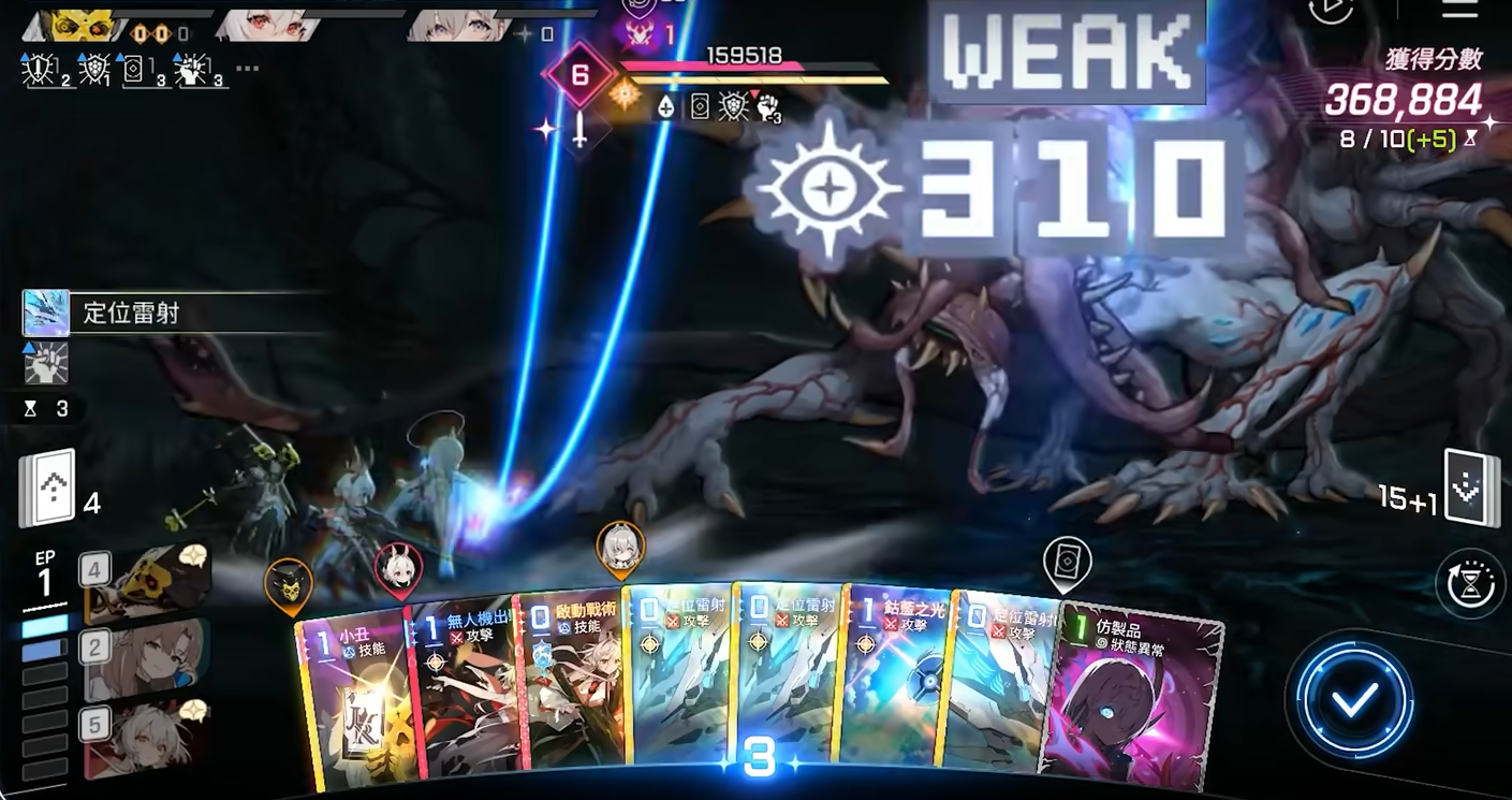 “定位镭射”为专属卡牌,存在多形态变体。基础形态造成150%伤害,击破时回手;若触发破坏效果,则额外追加一次打击,但该形态不继承残光,击破增伤权重较低,实战优先级靠后。相比之下,“残光三”为高适配性主力卡,能稳定覆盖全部攻击卡牌,是构筑中的核心组件。