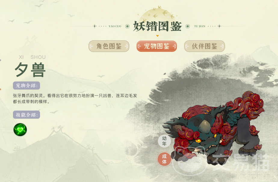 夕兽为群体协防向四足灵兽,幼体外观近似传统舞狮造型,成体后体色由赤红转为墨绿。主要分布于丛林覆盖度高的荒野地带。其核心机制围绕团队生存构建:基础技能提供稳定治疗量,配合被动威慑效果,可有效延长队伍整体作战时长,降低操作失误导致的减员风险,是组队PVE内容中的高适配辅助单位。