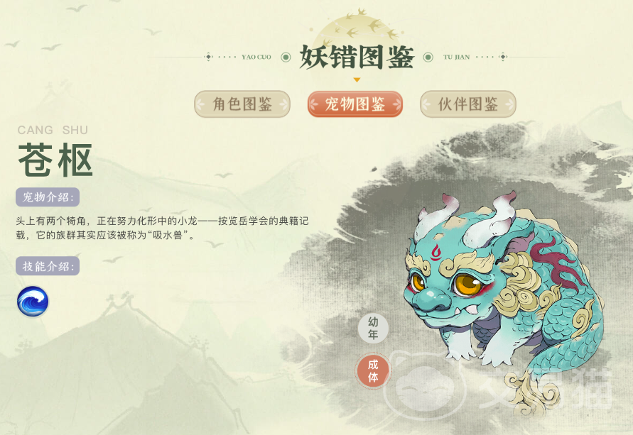 苍枢为水系主导型四足契灵,幼年期具双角,成年后可蜕变为半龙形态。古籍称其族类为“吸水兽”,对应技能【惊涛巨浪】具备持续伤害与场地控制双重效能。未幻化阶段多栖息于湖泽水域,完全体则活跃于近海区域。该灵兽兼具中程持续输出能力与团队防御增益效果,适合承担副坦或功能型C位角色。