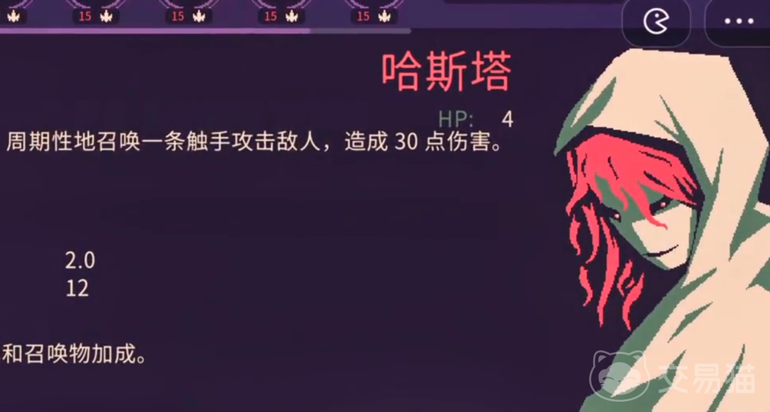 成功通关神庙后,哈斯塔将自动加入角色池。其基础生命值为4点,在全角色中处于偏低水平,因此操作上强调走位规避与节奏控制,避免陷入围攻。核心被动技能为周期性生成一条触手,每次攻击固定造成30点基础伤害,该机制构成“触手流”的输出根基。后续可通过关卡奖励、天赋树及装备词条对触手数量、存在时间与伤害倍率进行强化。