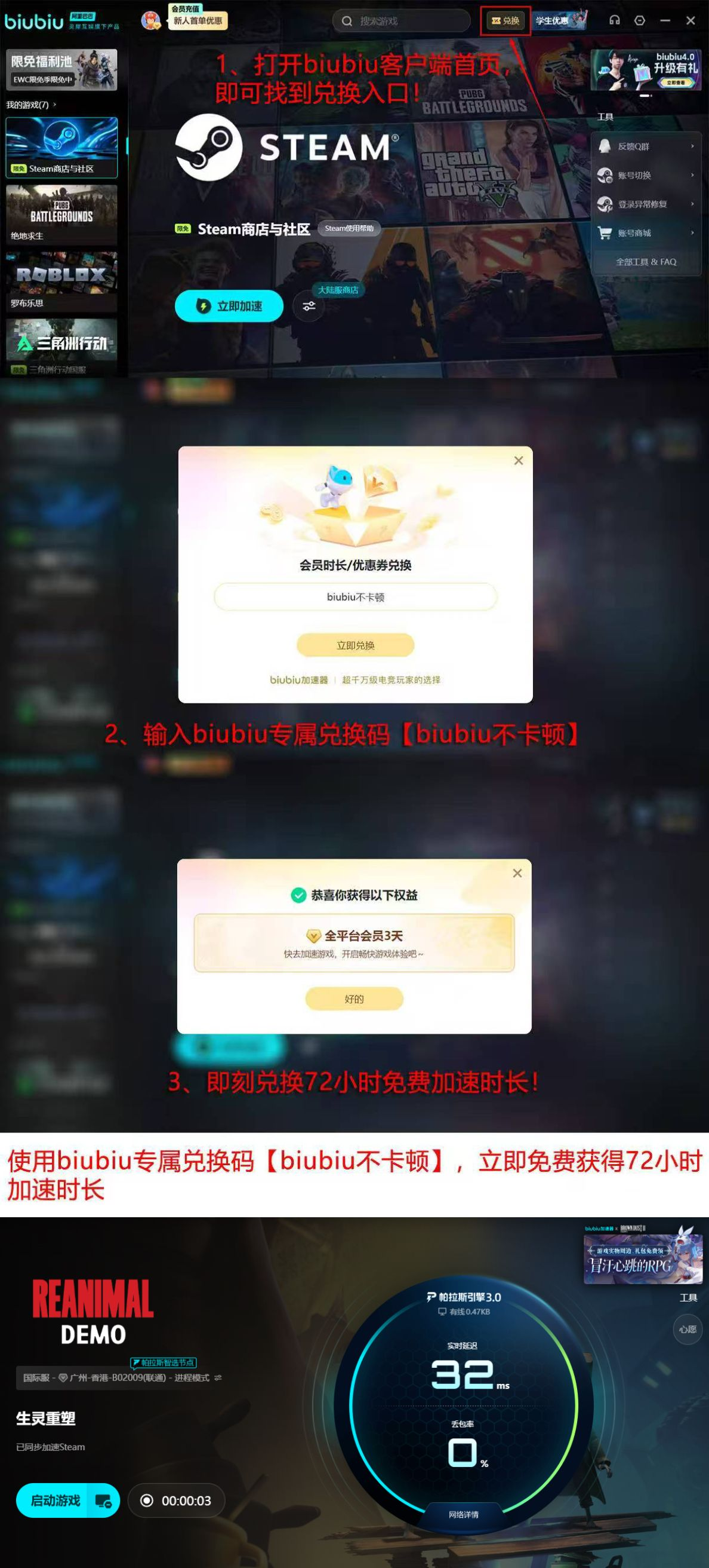 平台提供多项新人权益:注册即赠24小时免费加速时长;全用户开放3天无门槛体验期,兑换口令为【biubiu不卡顿】,需在指定活动页面完成领取。