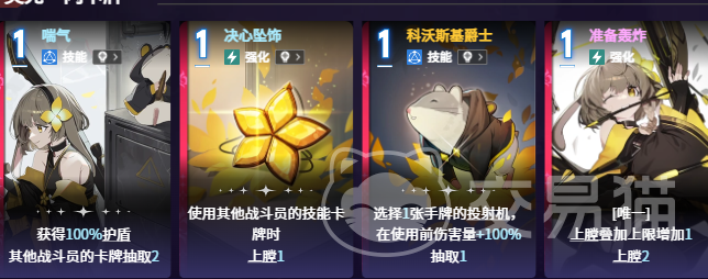 进入中期,强化类卡牌开始发挥主导作用。“准备发射”是唯一具备开战触发机制的强化卡,开局即生成1张投射机,并在之后每回合稳定补充1张,持续扩充投射体系规模。“决心坠饰”则侧重协同性,当己方队友使用技能卡时,立即完成一次上膛动作,有效适配多角色联动阵容,既提升叠层速度,也为后期高爆发输出奠定资源基础。