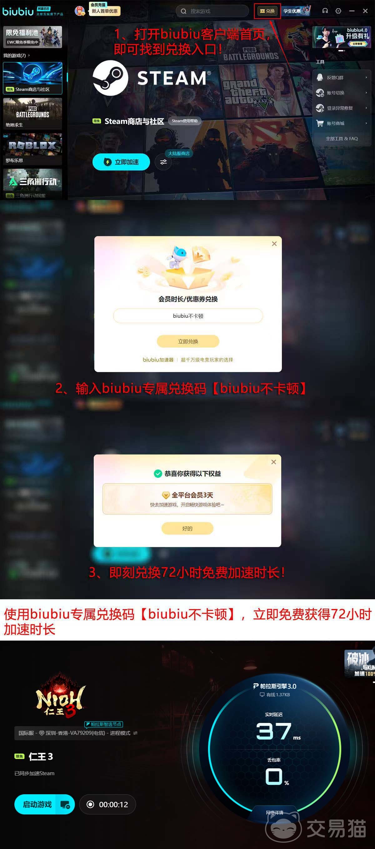 对于新用户,注册即赠24小时免费使用时长;另可通过首页“兑换”功能输入口令【biubiu不卡顿】领取额外72小时权益,合计可享96小时完整加速服务。此机制覆盖试玩版至正式版全周期,确保玩家当前积累的存档数据可在正式上线后无缝继承,避免重复开荒。