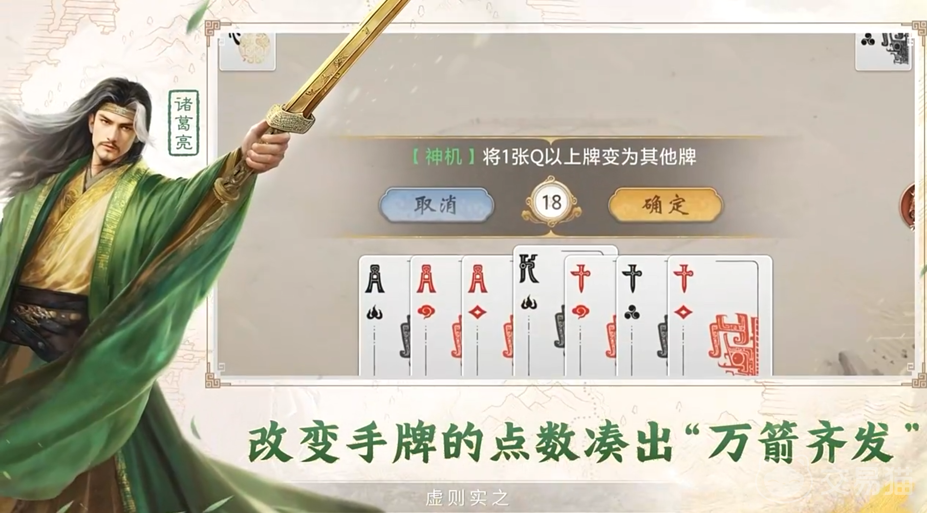 赵云具备高容错的手牌转化能力:弃置任意单牌或对子,即可解锁万能牌使用权限,大幅提升组合灵活性;诸葛亮则以信息掌控见长,“妙算”支持分阶段查看底牌,“神机”可将点数大于K的手牌,统一转化为当前手牌中数量最多的牌型,显著优化出牌结构。