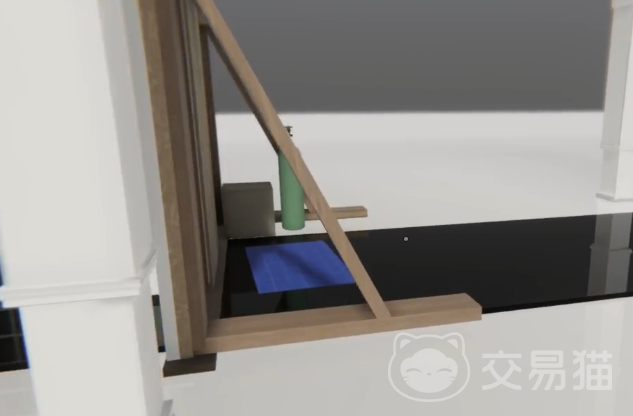 新区域中央矗立一栋独立房屋。从侧方电箱攀爬至屋顶,点击获取第一张蓝图。下楼后依据场景中悬浮圆锥体的指向行进,临近目标门扉时天象突变,开始降雨。穿过雨幕中的门,进入双排密闭走廊,无视两侧房门,笔直前行。