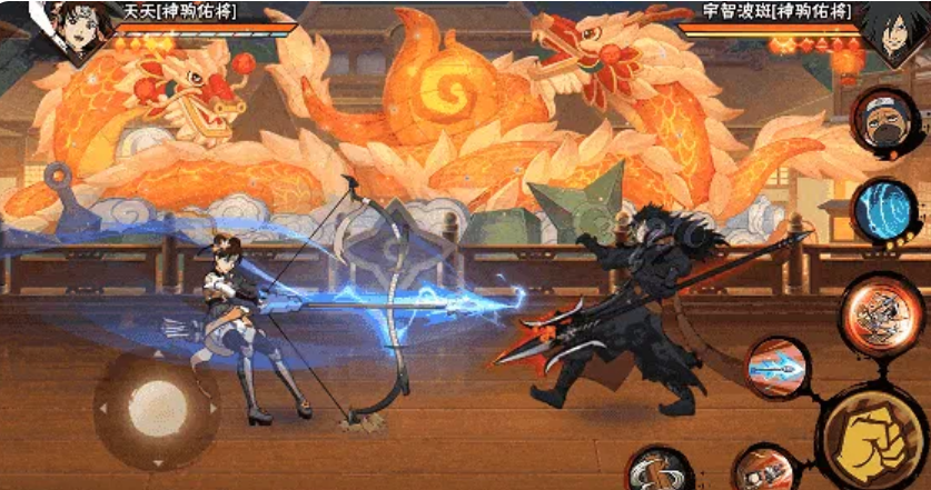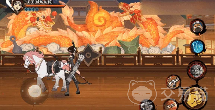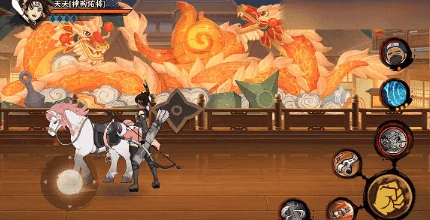 主动技能“弓调马服”分为两段。首段为点按触发:天天转身展开卷轴,随即完成一次随机属性箭矢的装填(每次装填固定为10支),同时释放一次范围炸气攻击;装填完成后,对应属性的二段技能图标即刻解锁,可在限定时间内点击释放;若未及时使用,该技能将进入大幅缩短的冷却状态。
