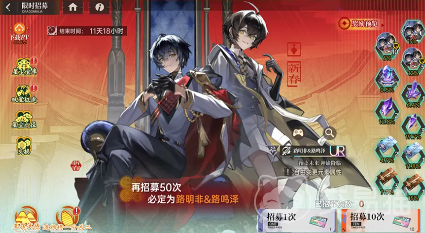 活动期间,玩家每日登录即可领取UR招募卷,累计使用UR招募卷进行召唤,最多50次必得UR伙伴路明非与路鸣泽。同时开启“王庭试炼”副本,按阶段推进挑战进度,每完成一个难度节点均可获得活动代币“星之砂”,通关高阶关卡还可登上全服榜单,赢取限定道具“青铜吊坠”。